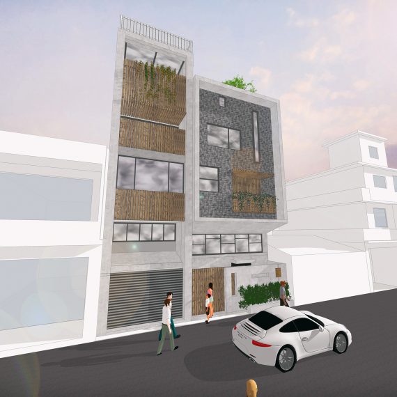 整棟建築體以灰色板岩磚為色調設定,正面縮框稍退形成一層次的立面關係,覆貼上較為深色系的石材。無論是退縮而入的陽台,或是大面開窗處,皆依照本意上的遮掩設計概念。利用大量的4*4CM的杉木角料來作格柵修飾,木頭~柔化了建築體生硬的線條,亦達成了隱私上的心理需求。