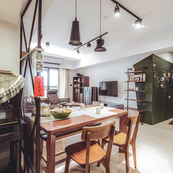 使出第一殺招 :【偷】,也就是在區劃動線及格局的當下,在有限的空間唯有這裡偷一點、那裡再讓一點…客廳偷一點出來給餐桌、主臥偷一角出來給鋼琴、開放出一間客房也偷出一點給廚房…。也就這樣,每個原本方正的各空間,各偷出一角互相的互補,分割出的格局線也就成為以下的”全斜線格局規劃”。