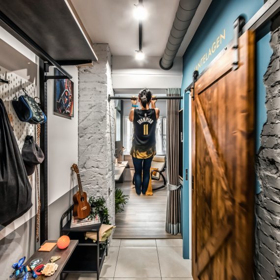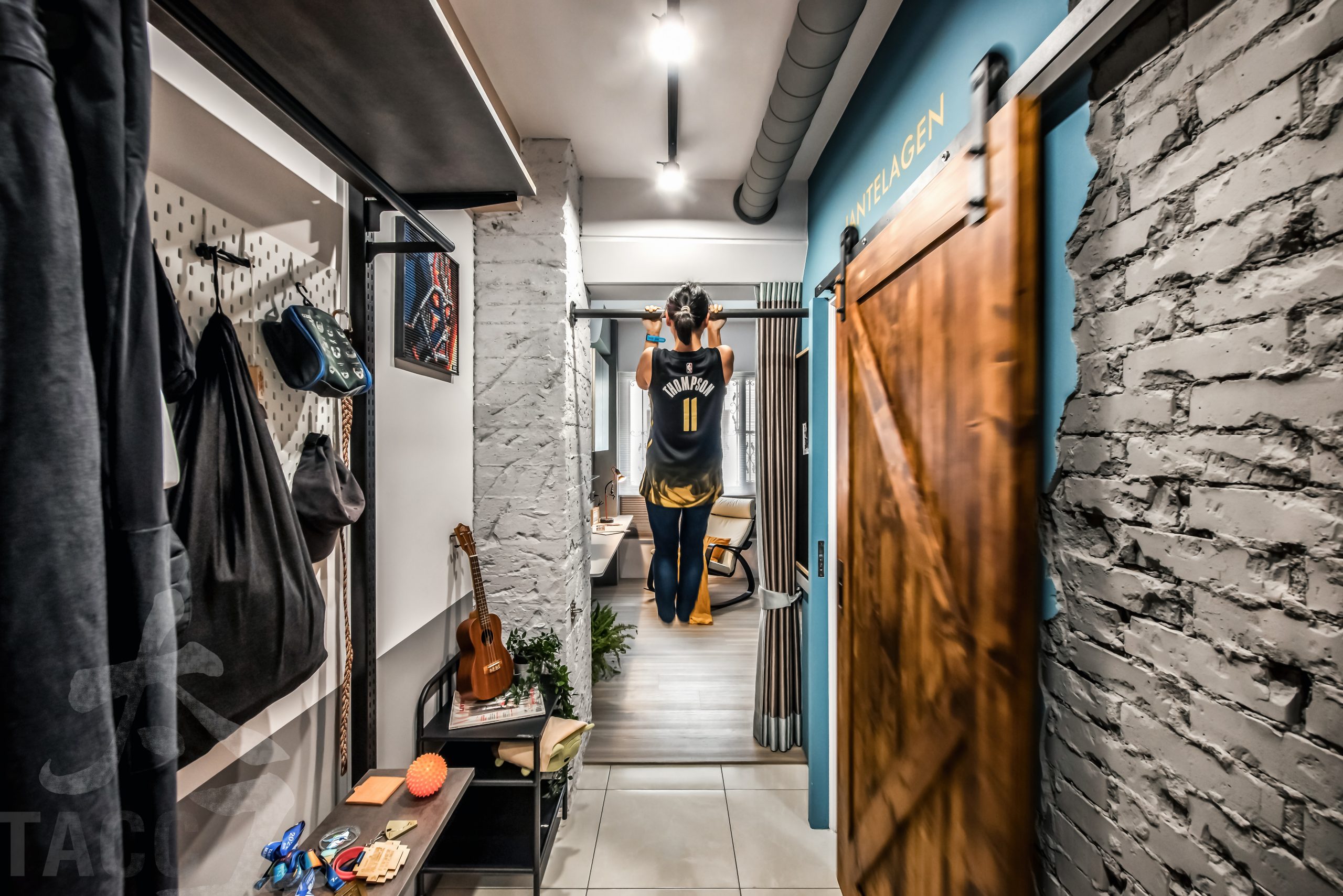 設計了一道有趣的樓梯側板,有鐵件木板交織而成,