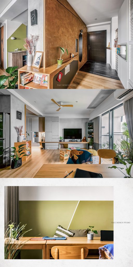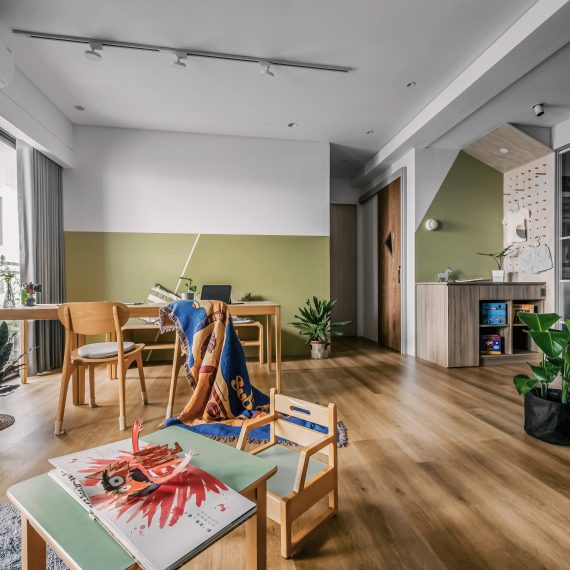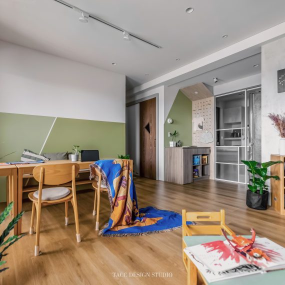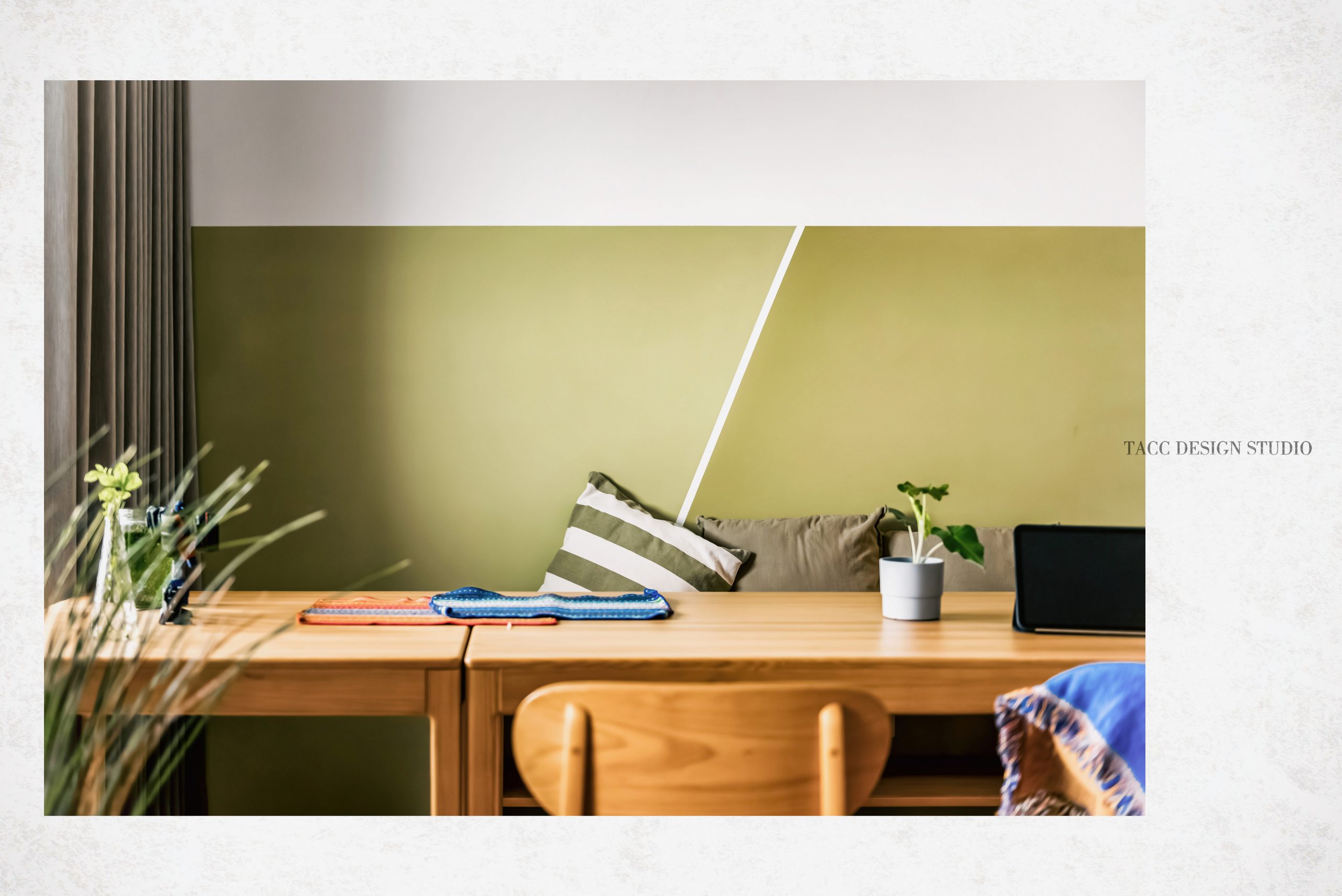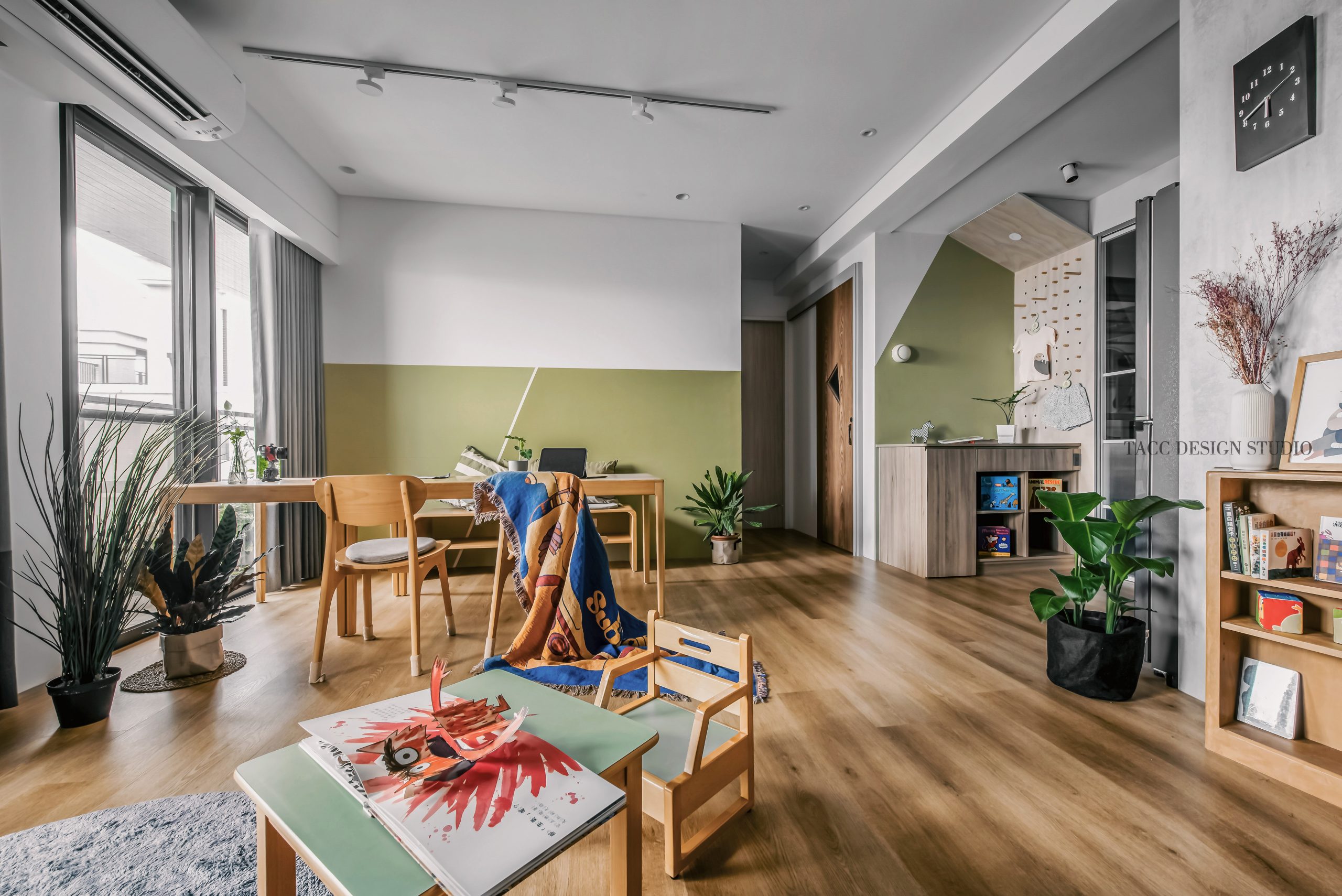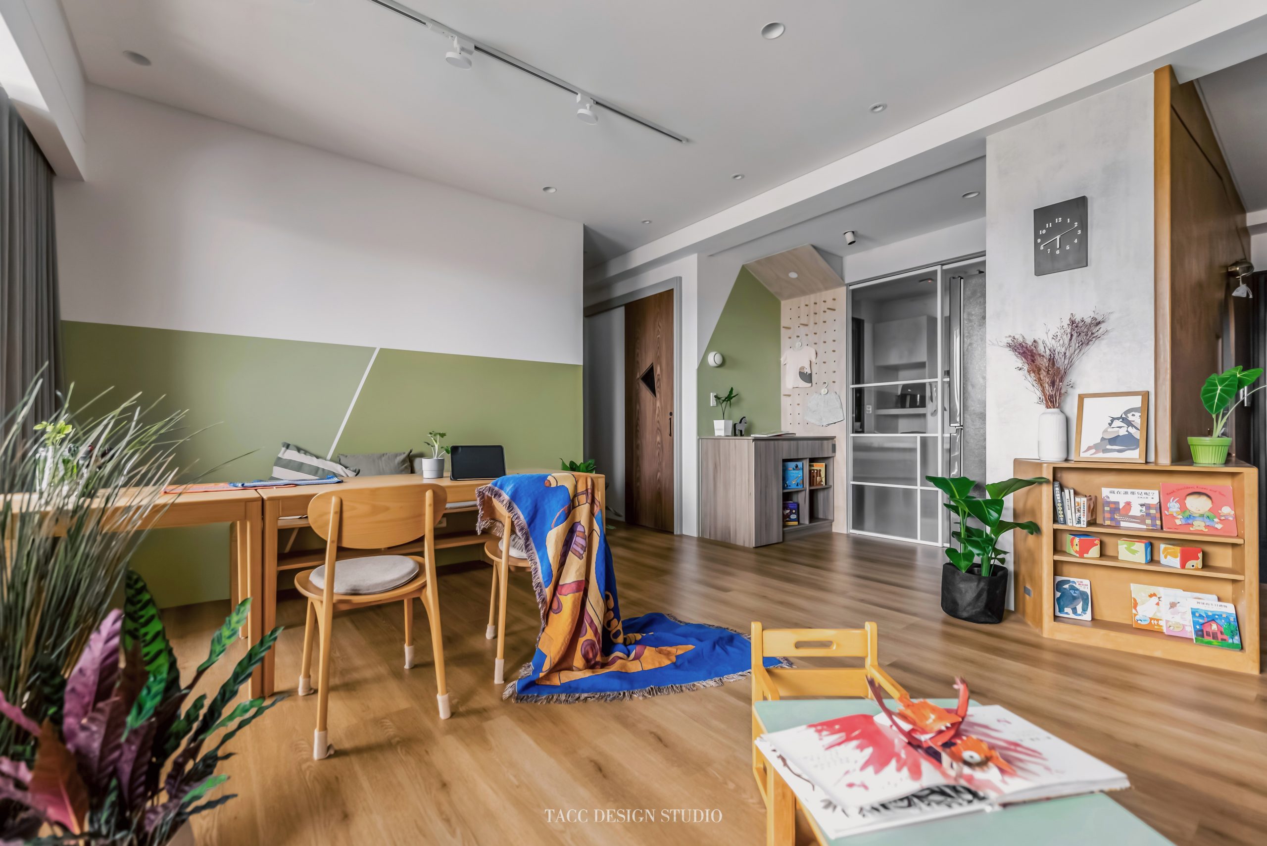 客廳其他處盡量的釋放,讓出空白給未來托育玩樂之用。擺上兩張桌子、周圍的牆塗上了綠,提示了這空間以自然的成色為基調。線條,隨著量體的出現隨之變化,把空間語彙刻得更有意思。