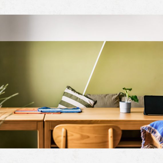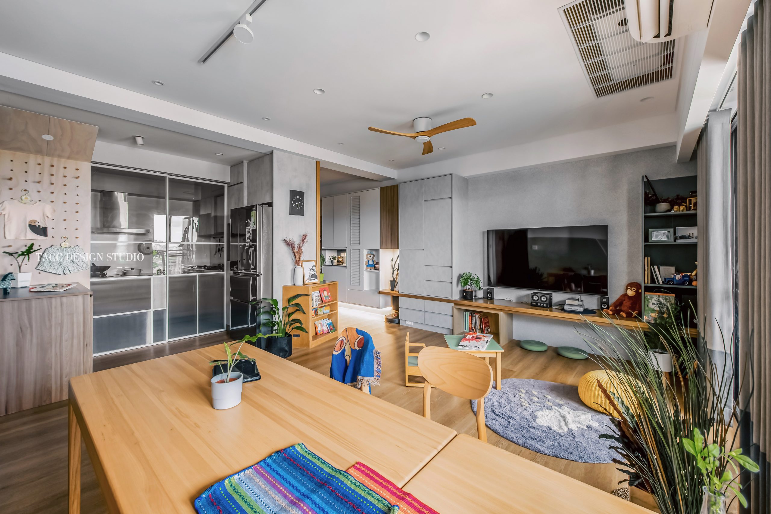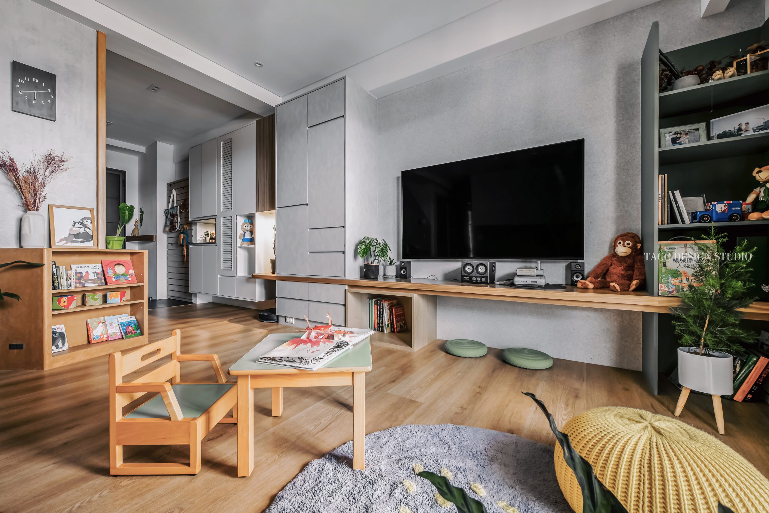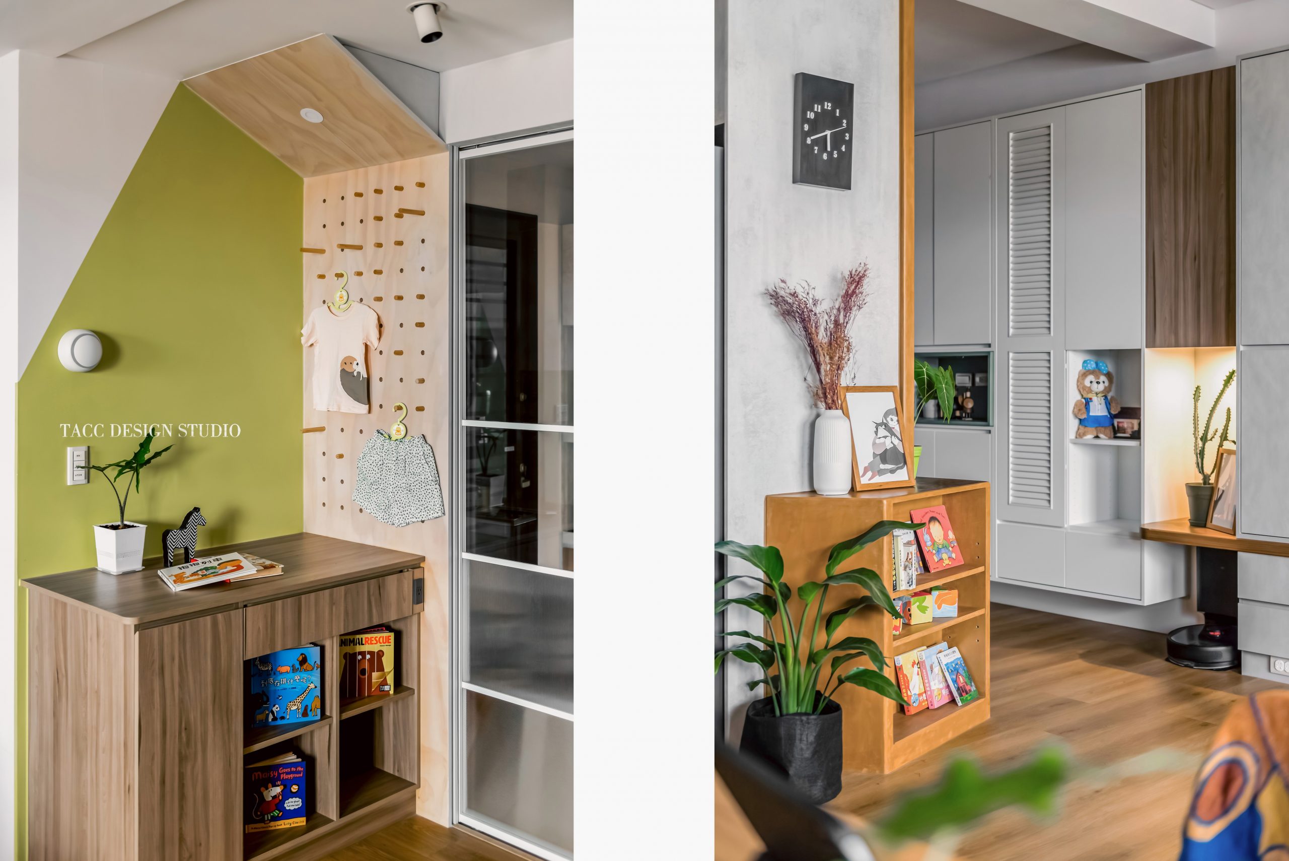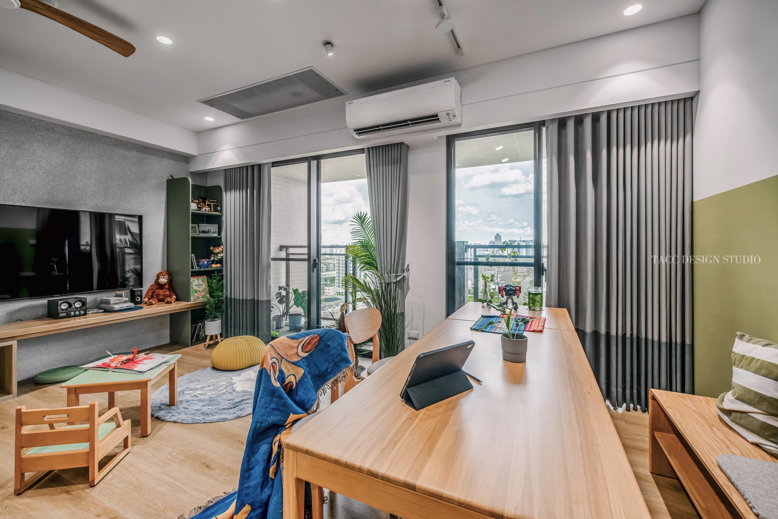 客廳其他處盡量的釋放,讓出空白給未來托育玩樂之用。擺上兩張桌子、周圍的牆塗上了綠,提示了這空間以自然的成色為基調。線條,隨著量體的出現隨之變化,把空間語彙刻得更有意思。