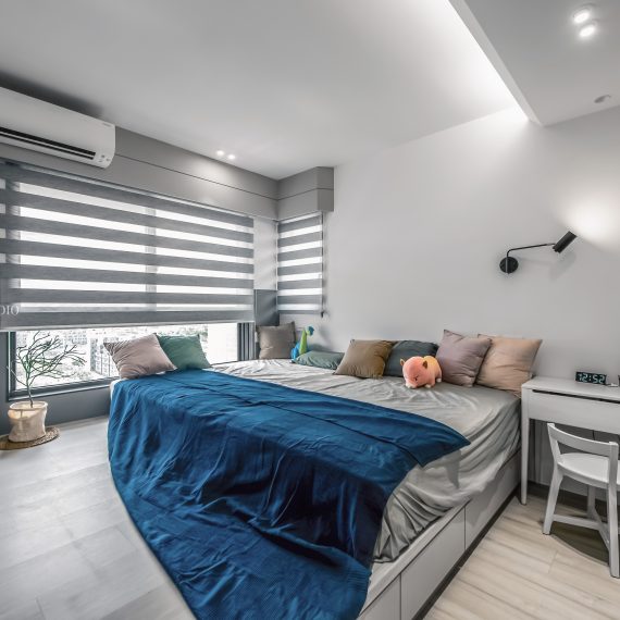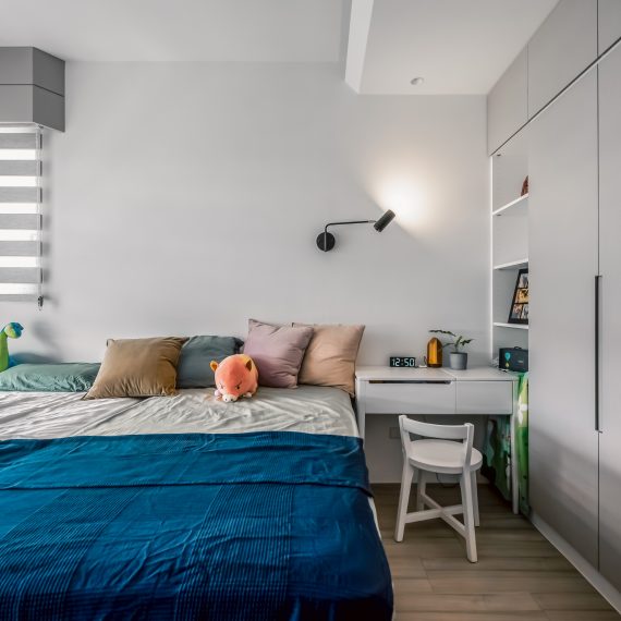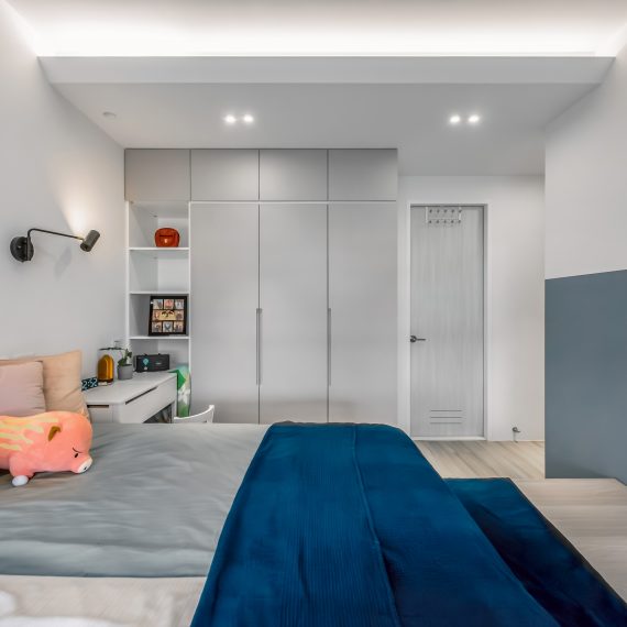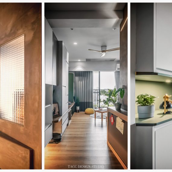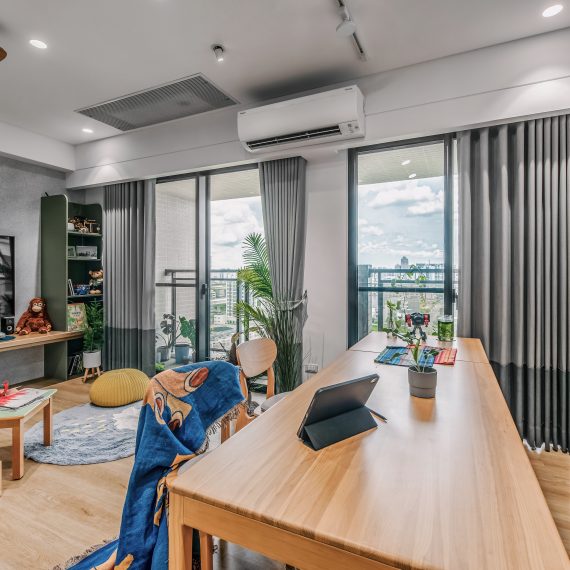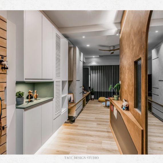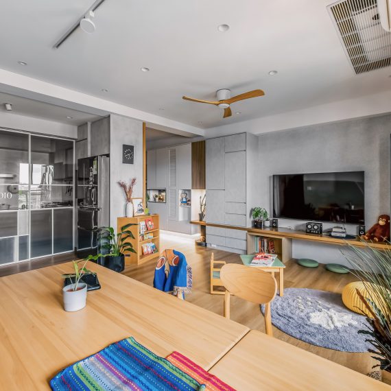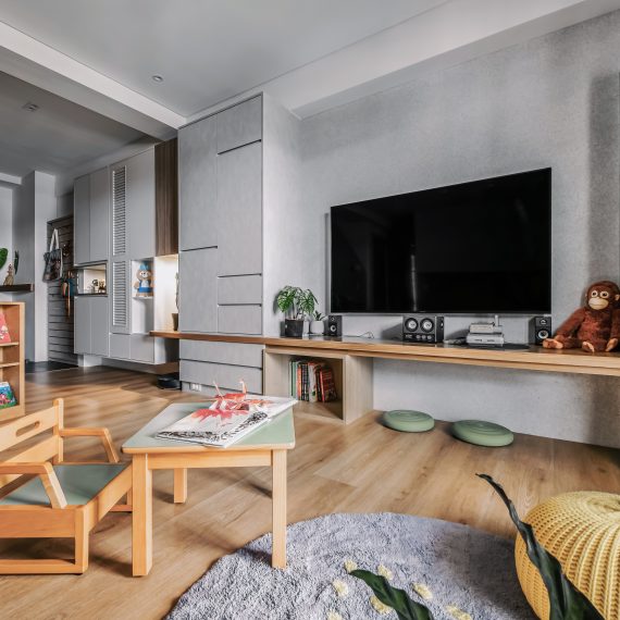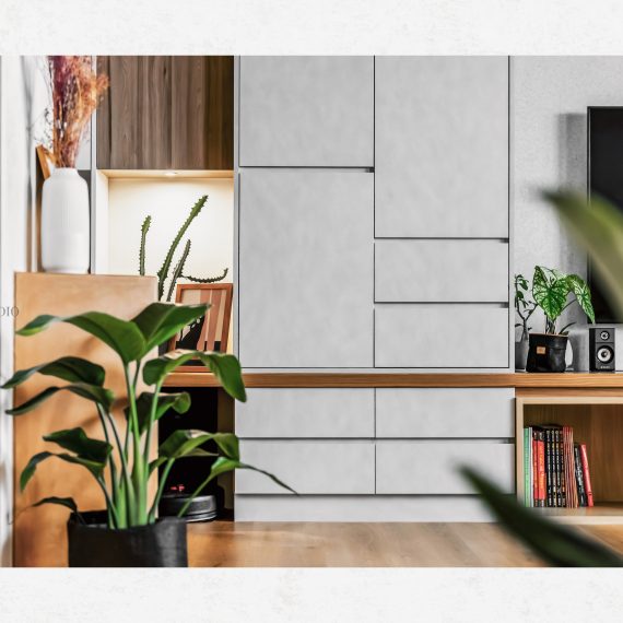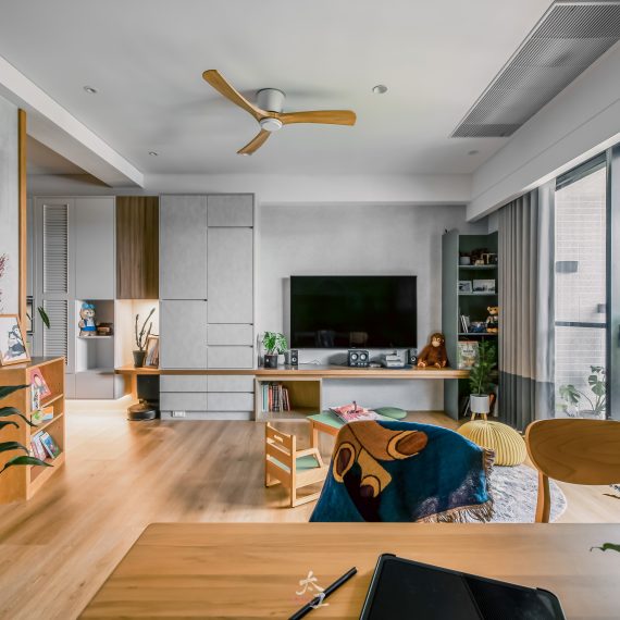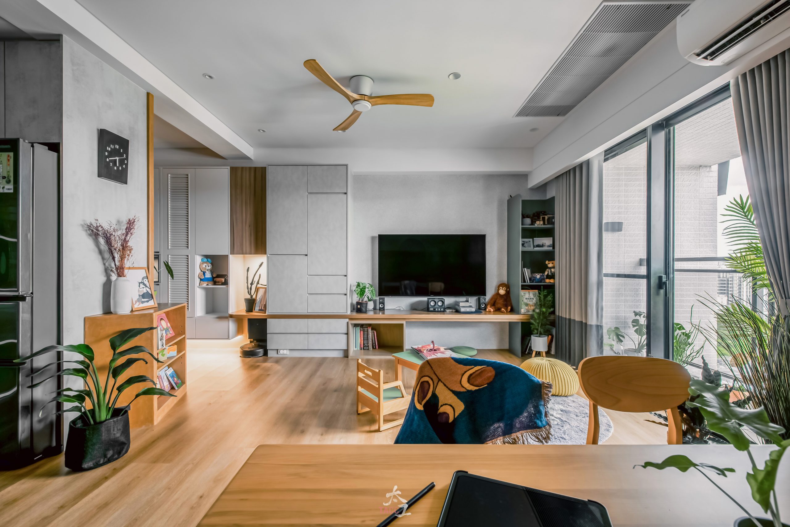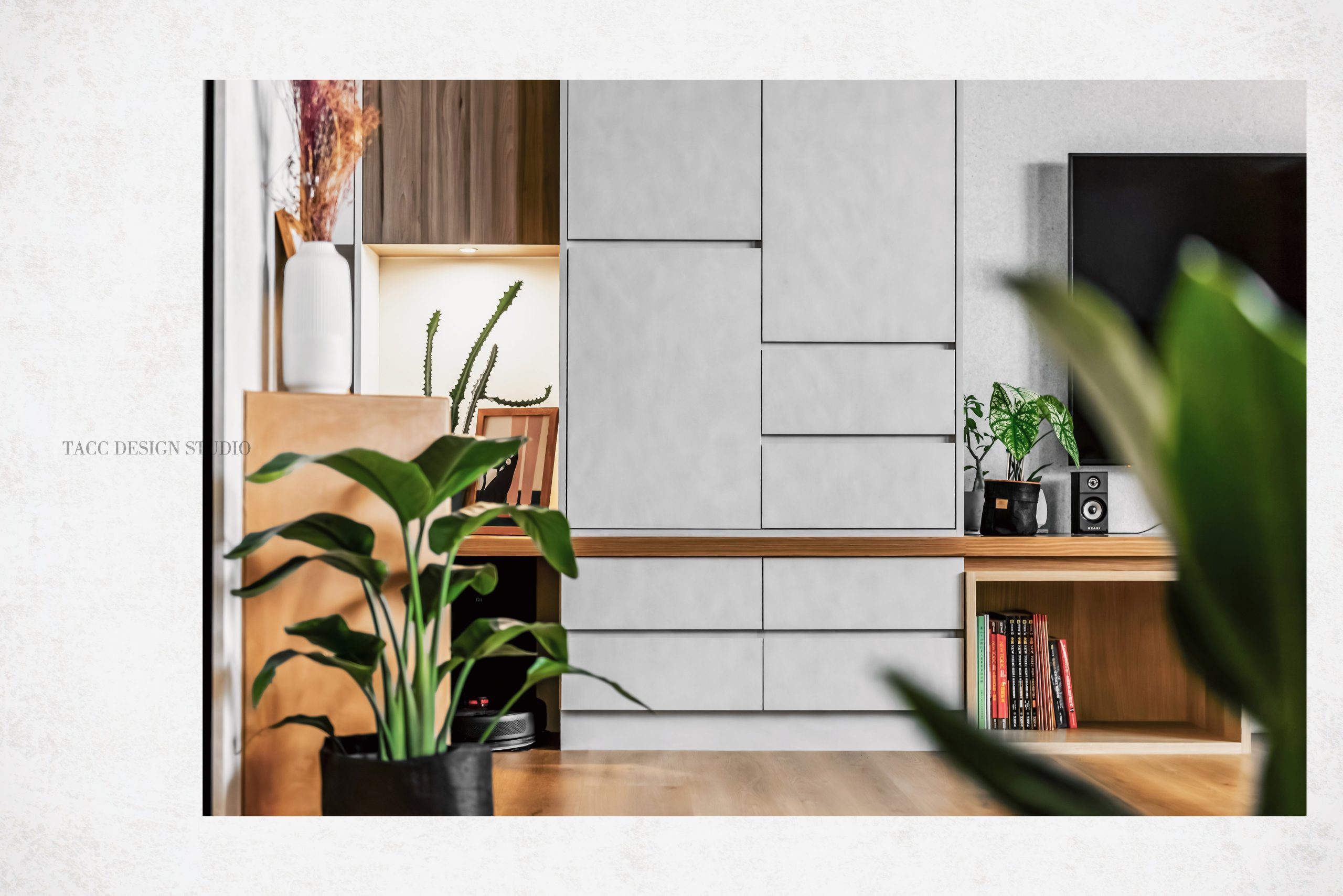 入門後的櫃體拼拼組組來到了客廳空間,一致的色調,穿插的是機能虛實間的呈現,無論是串聯的那塊木台、又或是一旁的綠色櫃,很寫意的完整了這空間的收納要求。