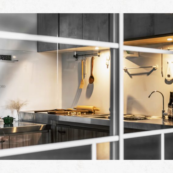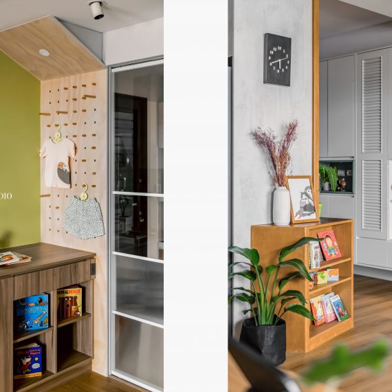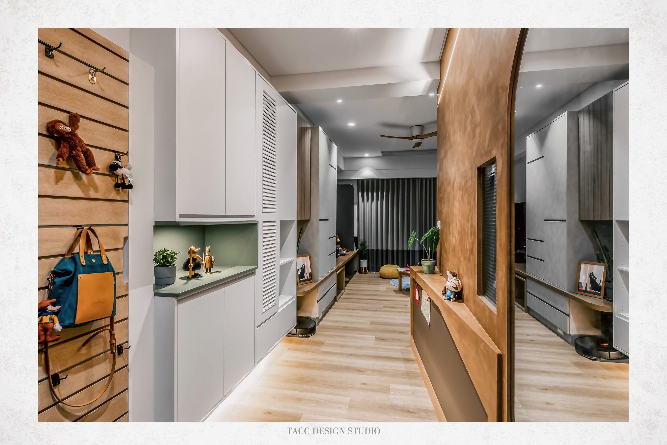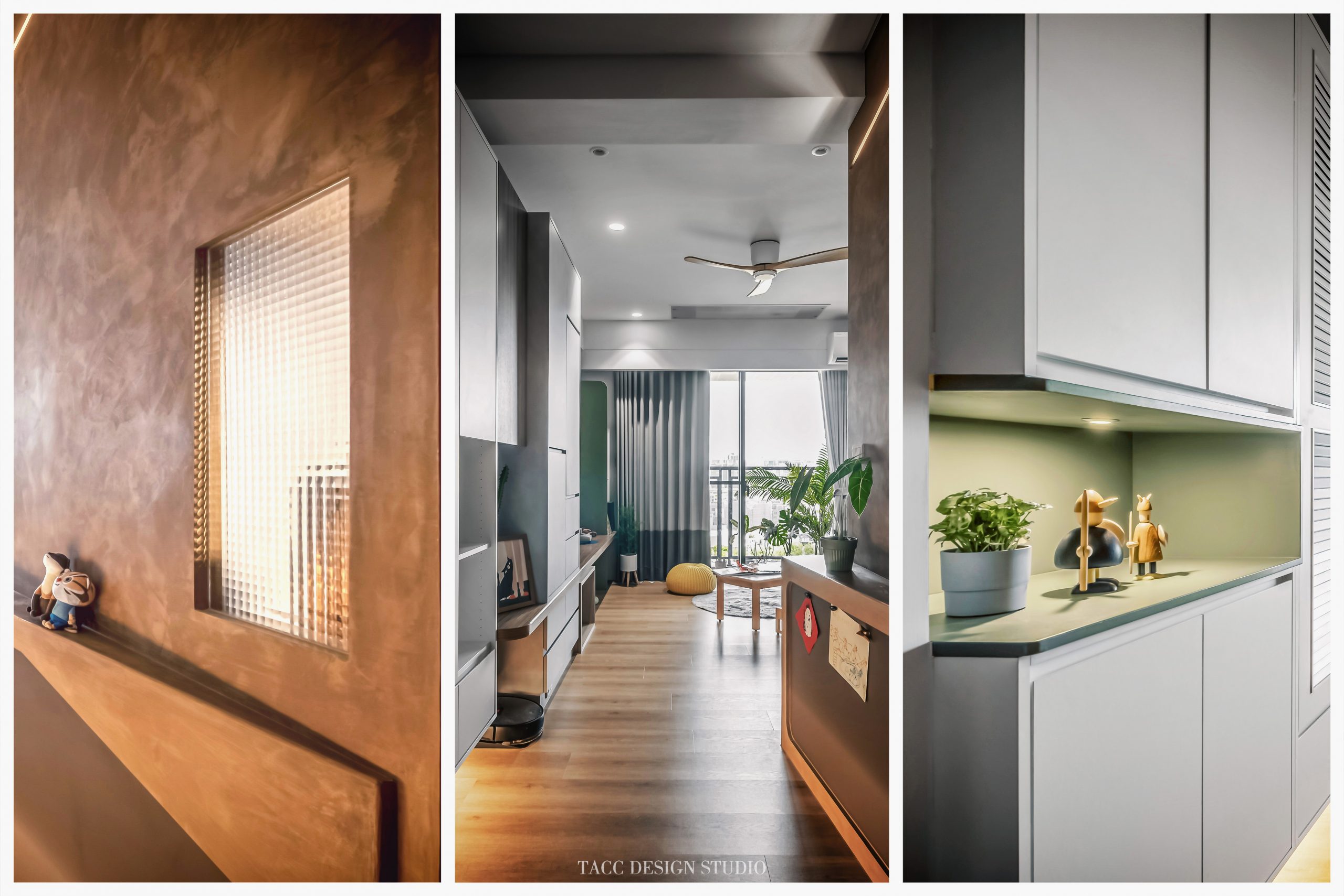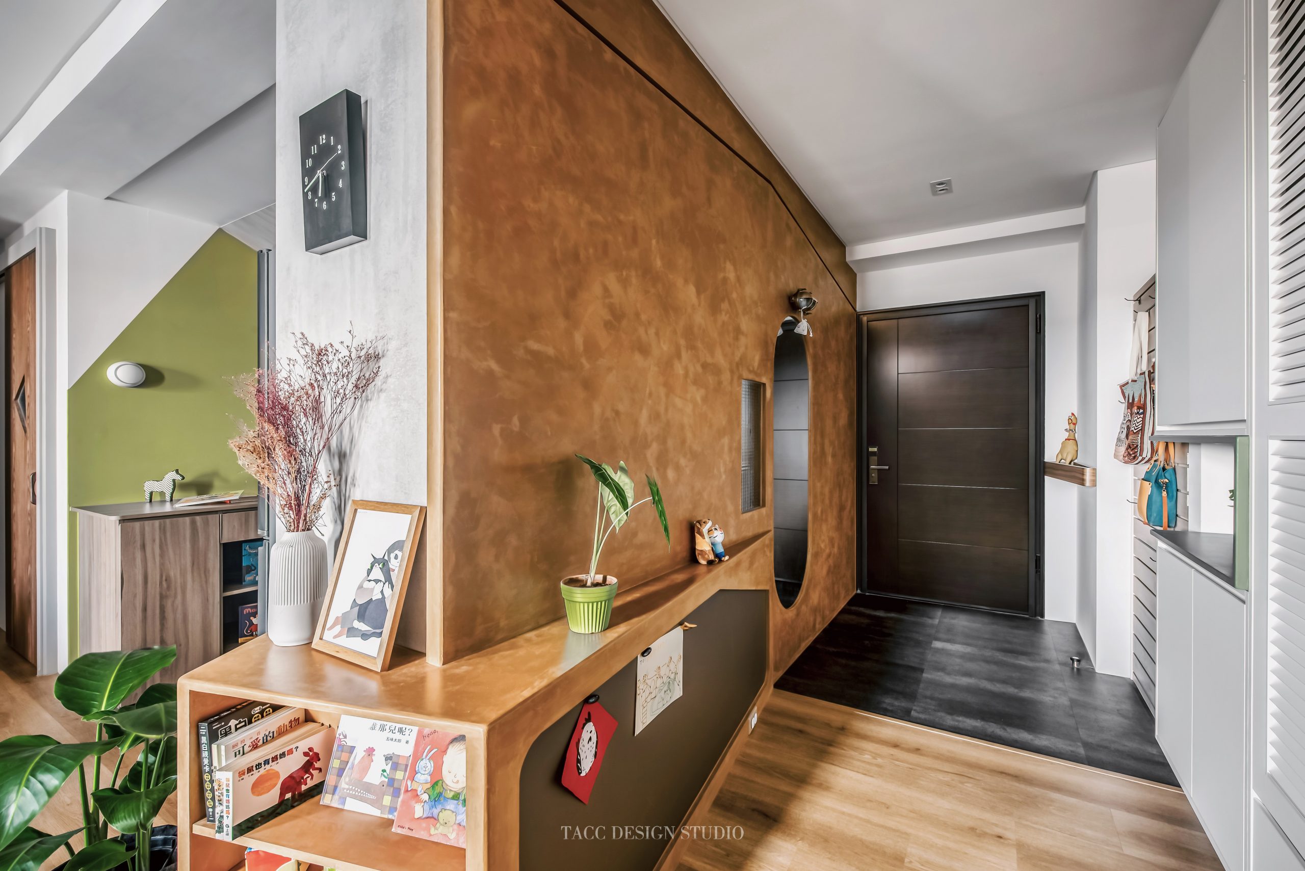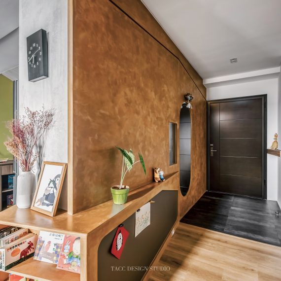 一開進門的玄關就很有戲,橘色調的隔牆劃分出內外的對應,直至尾端處變形一撇嵌櫃,將恐怕平凡的玄關道視覺有趣了不少;輕輕的坎上了鏡、玻,還可以擺點花花草草。