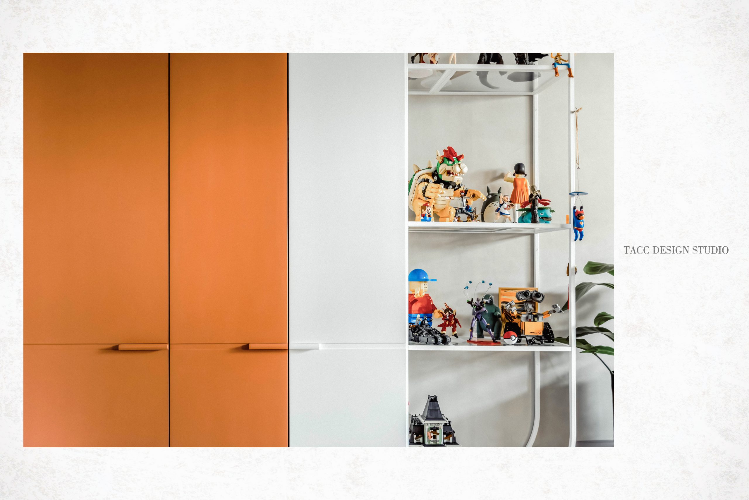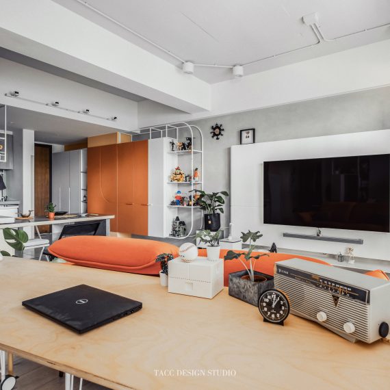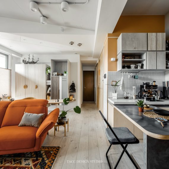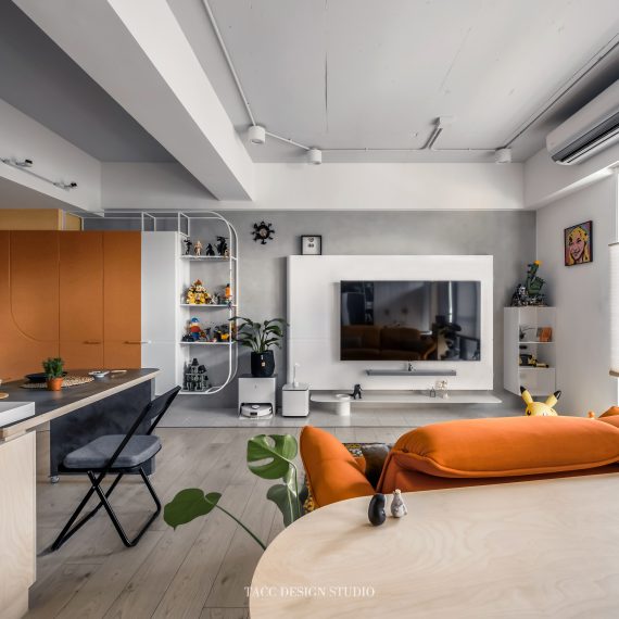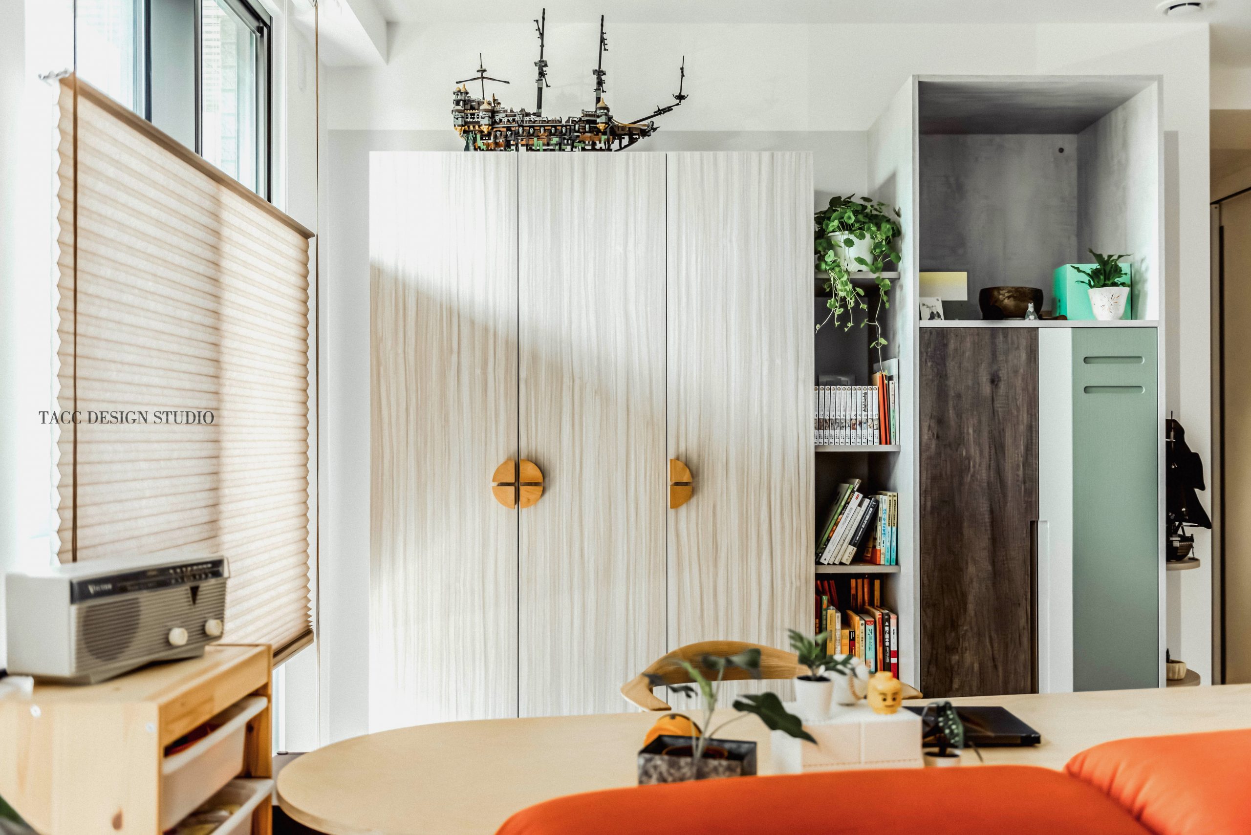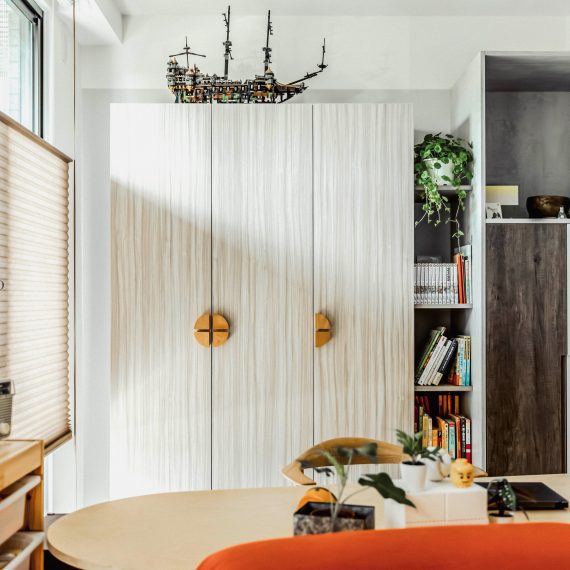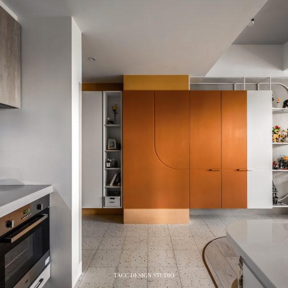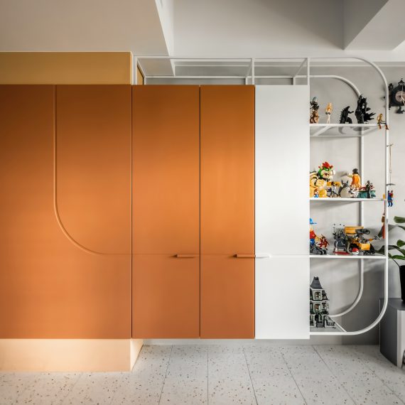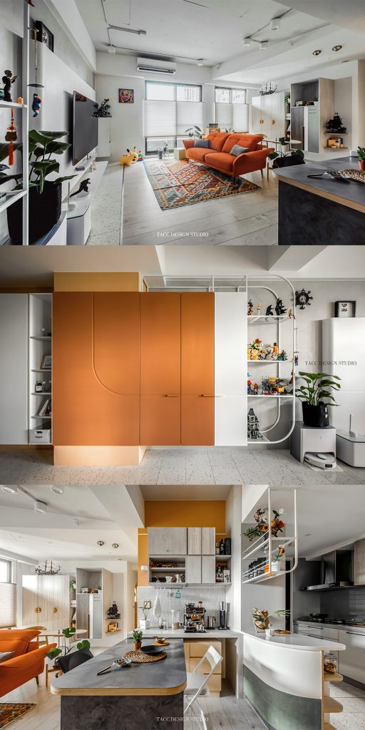 在與一側櫃體存在的當下,用上了一道橘色共同連接起來;