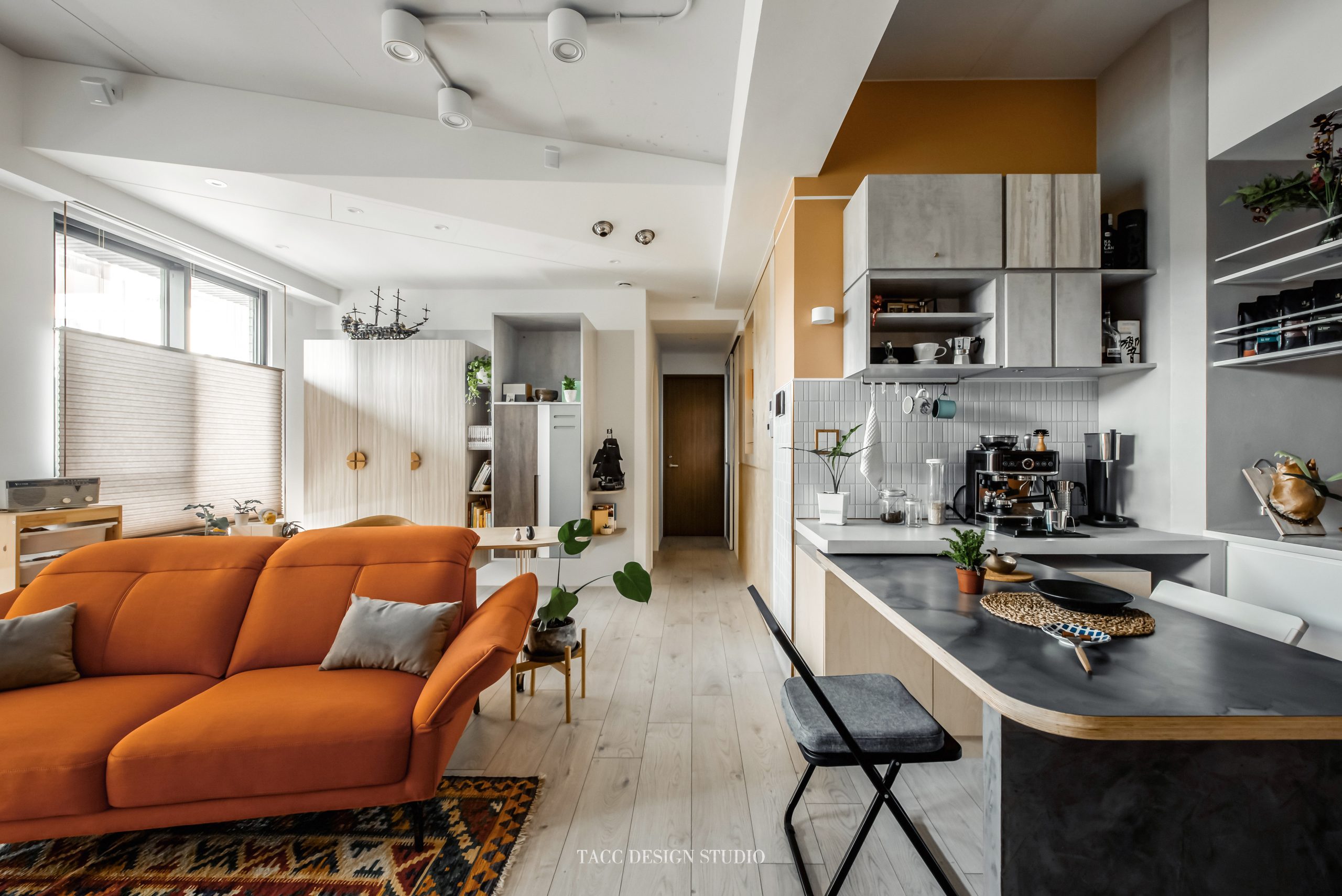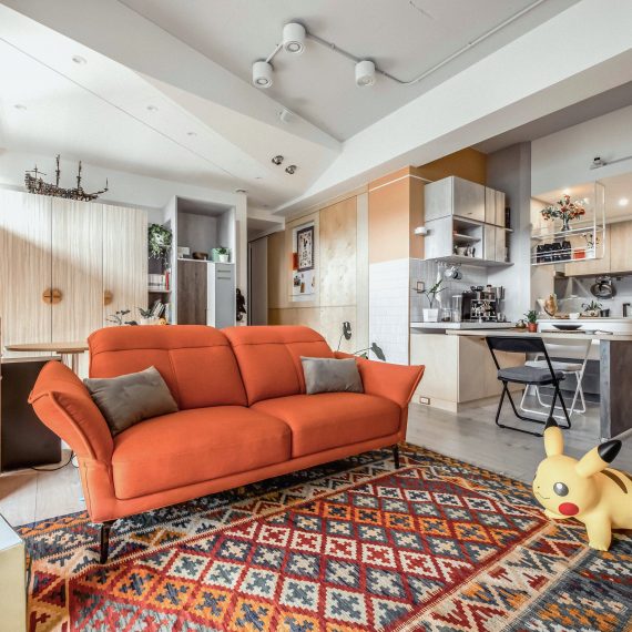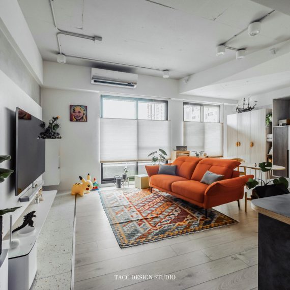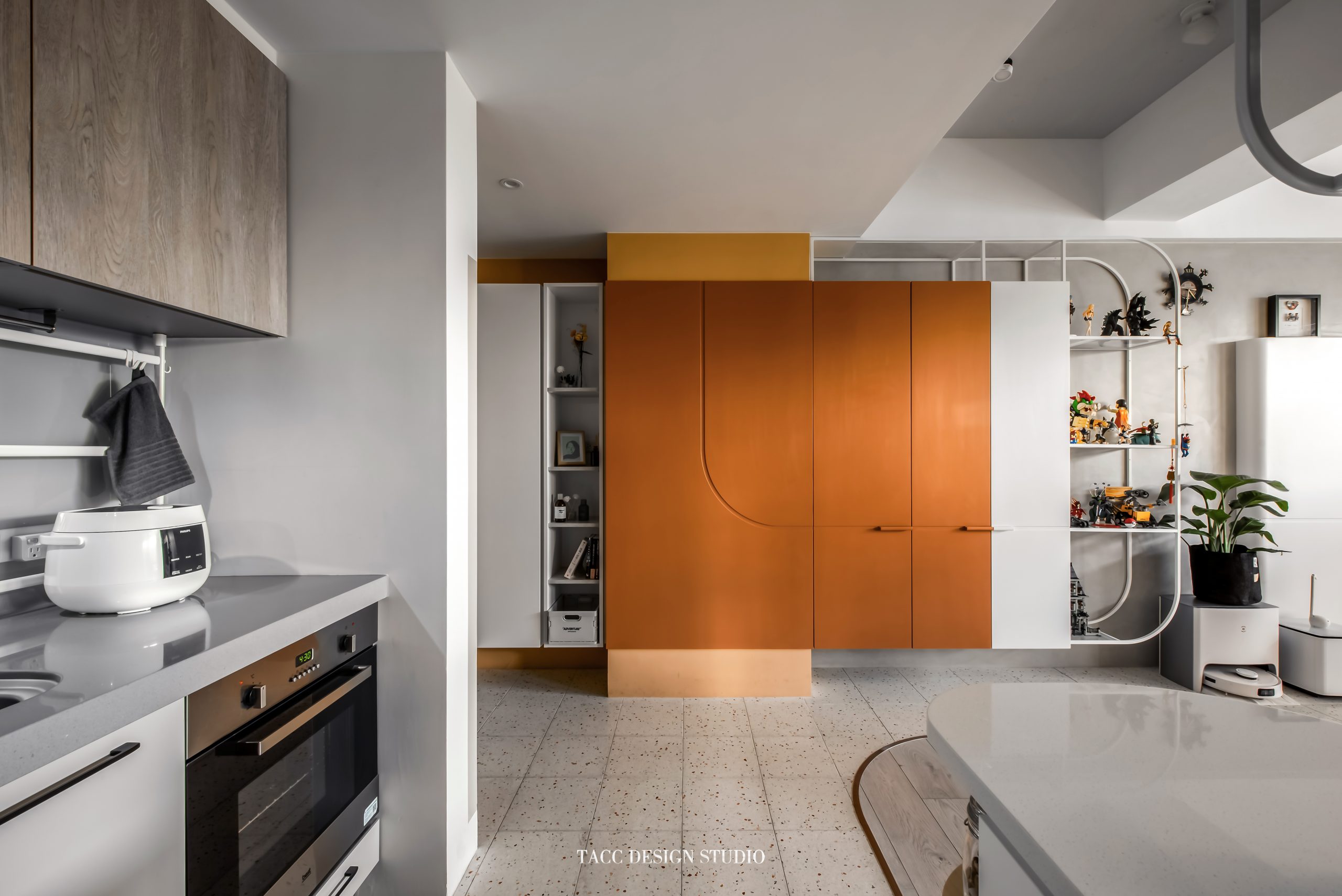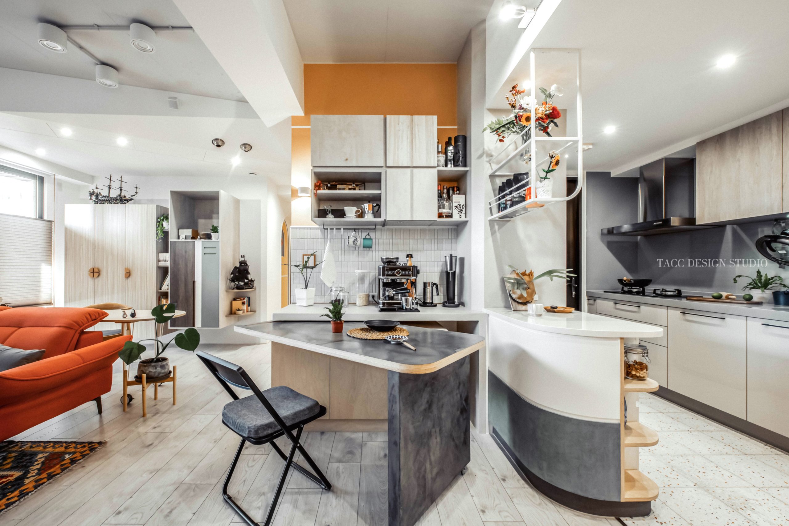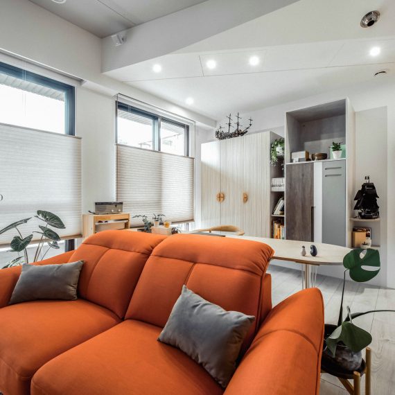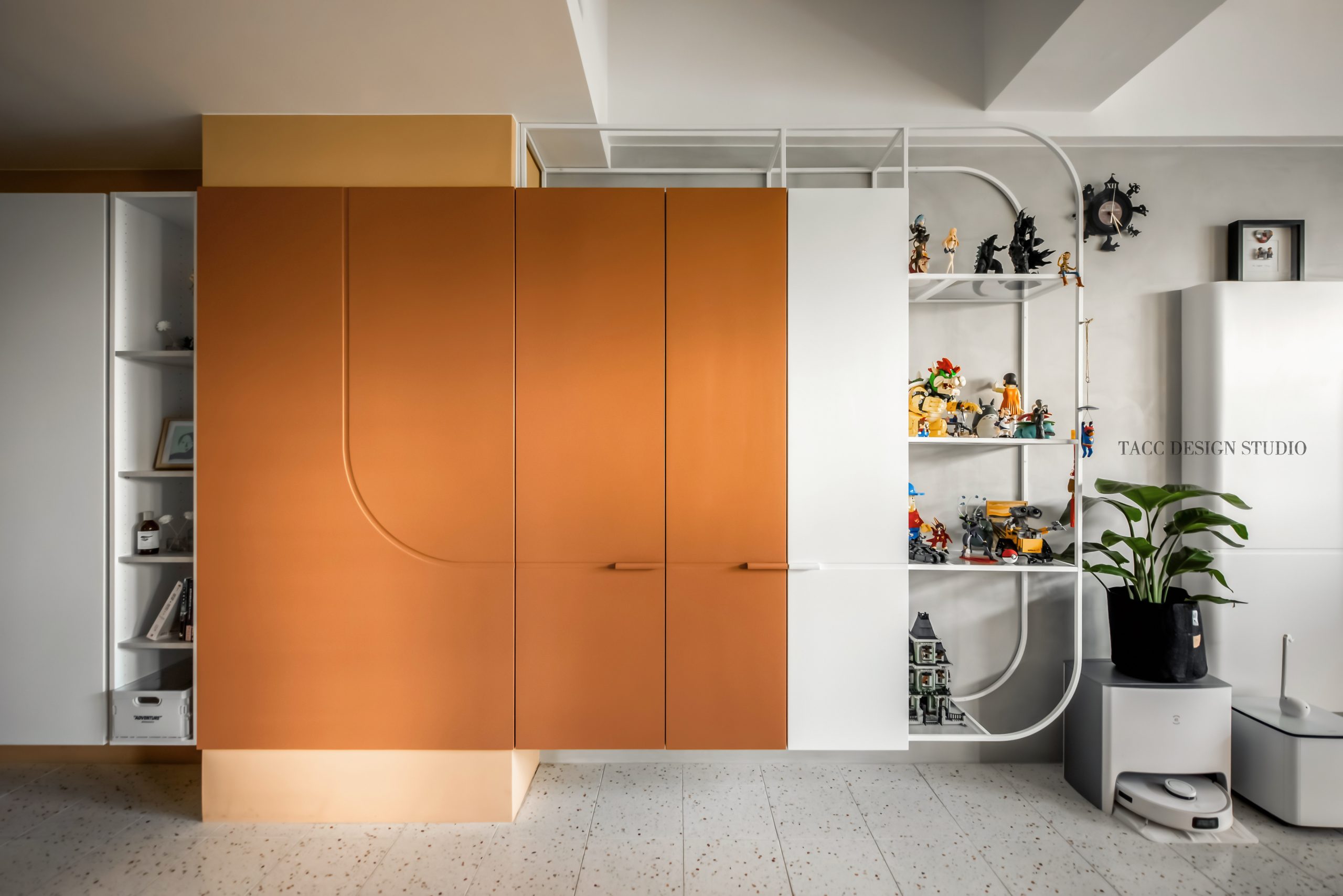 在與一側櫃體存在的當下,用上了一道橘色共同連接起來;