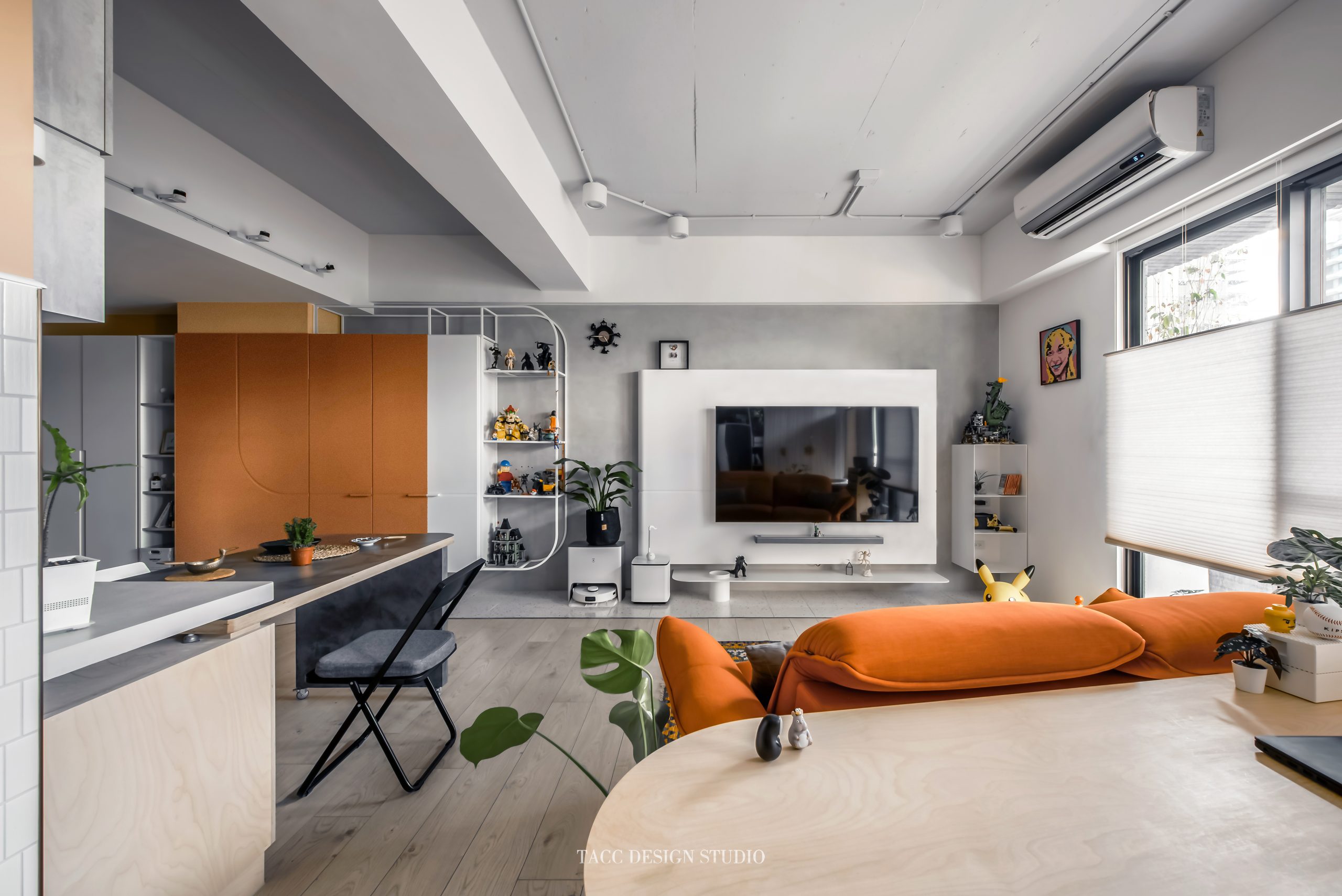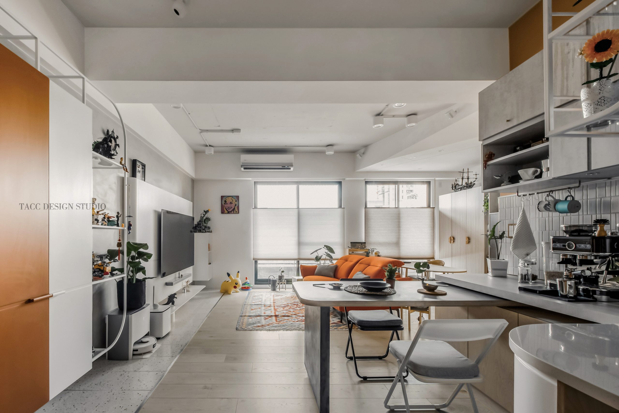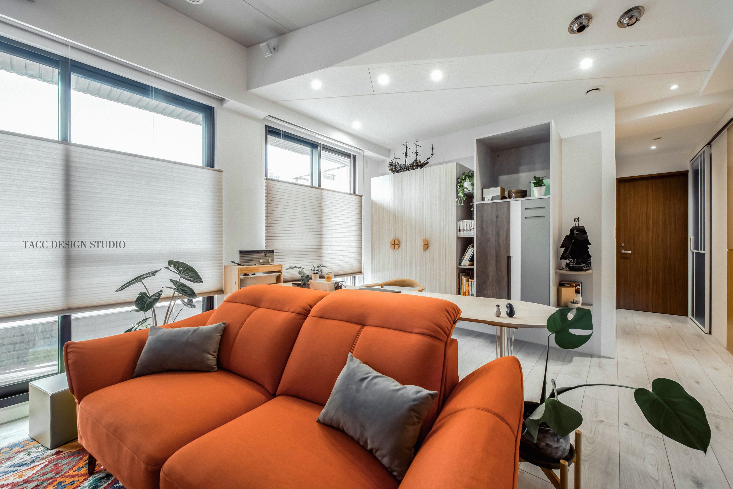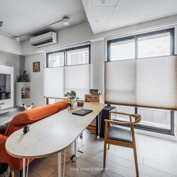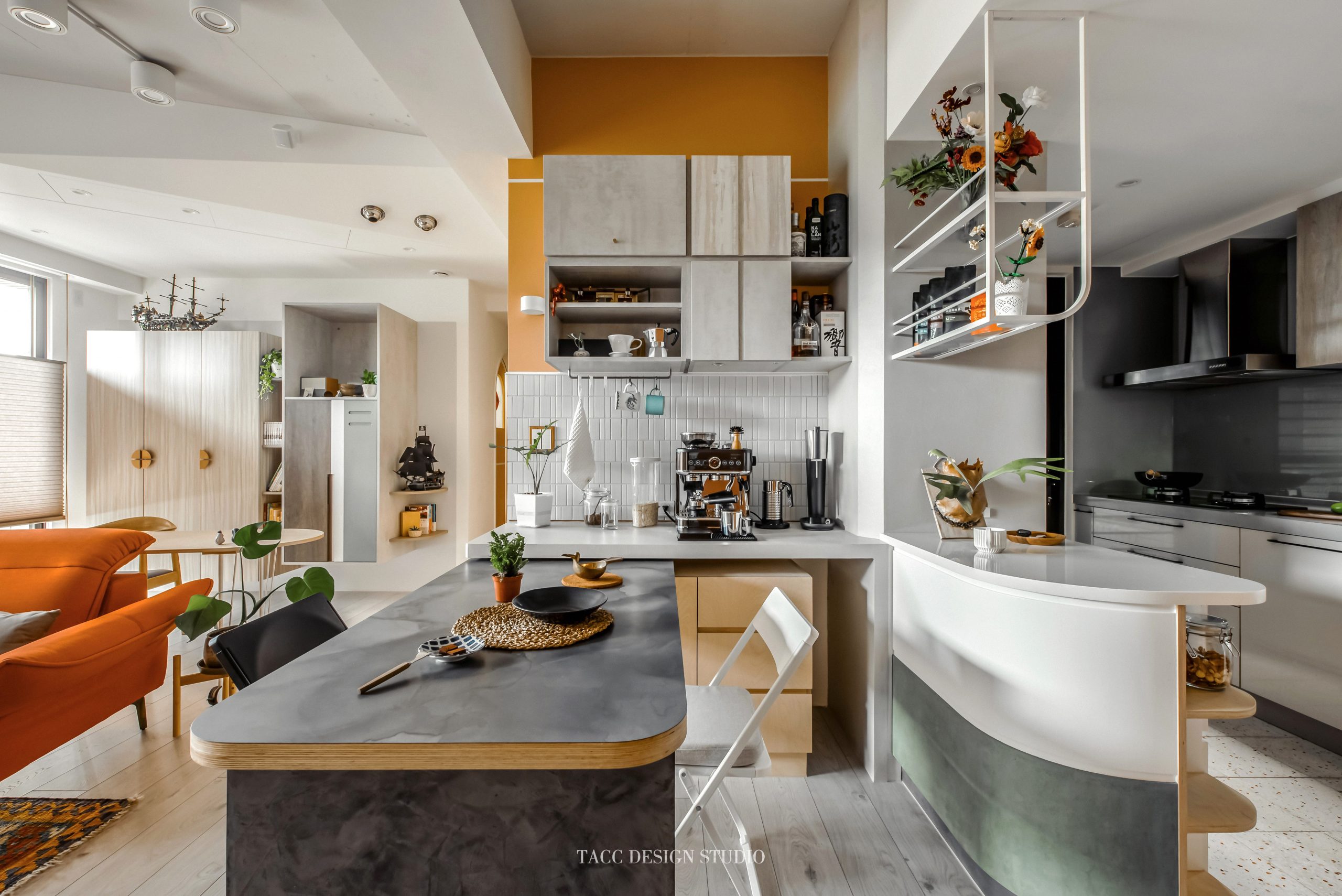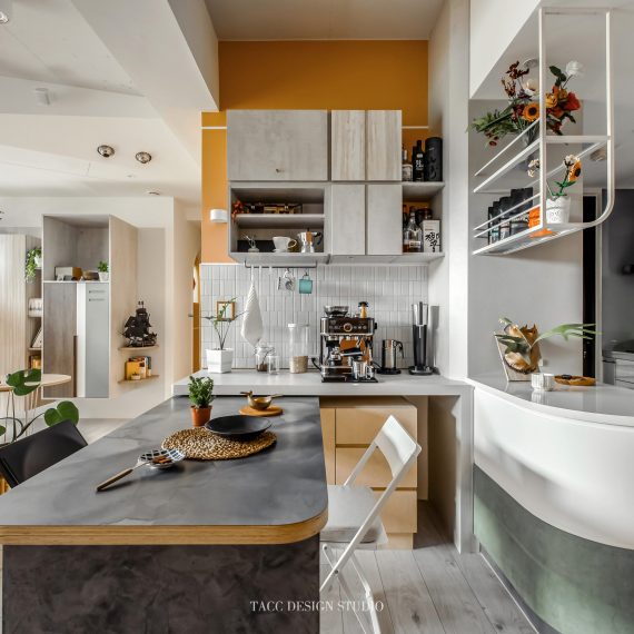 在與一側櫃體存在的當下,用上了一道橘色共同連接起來;