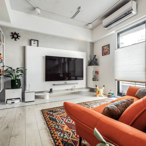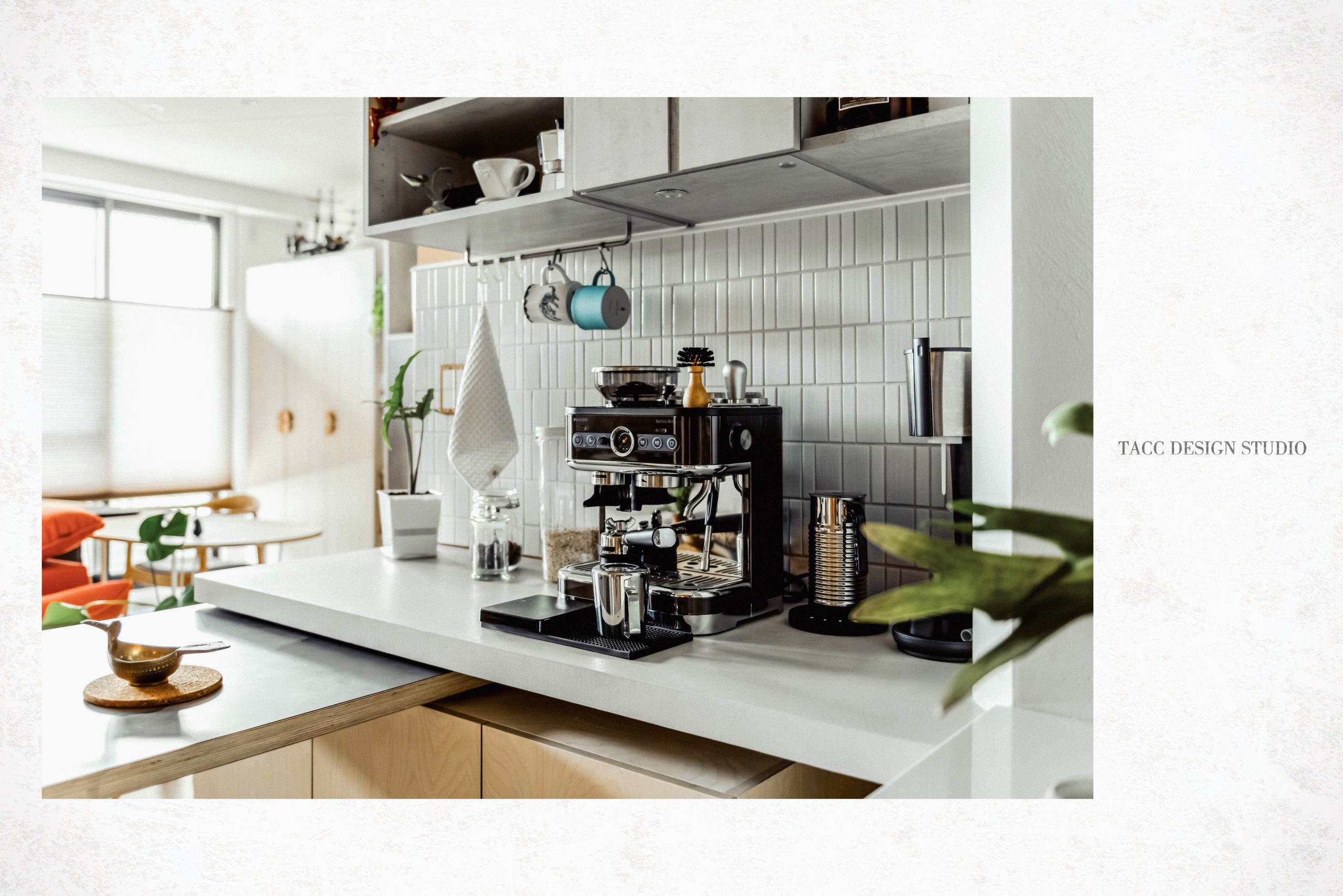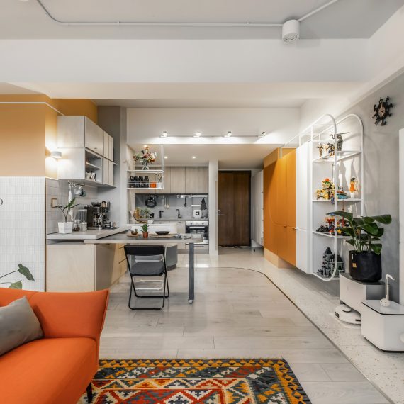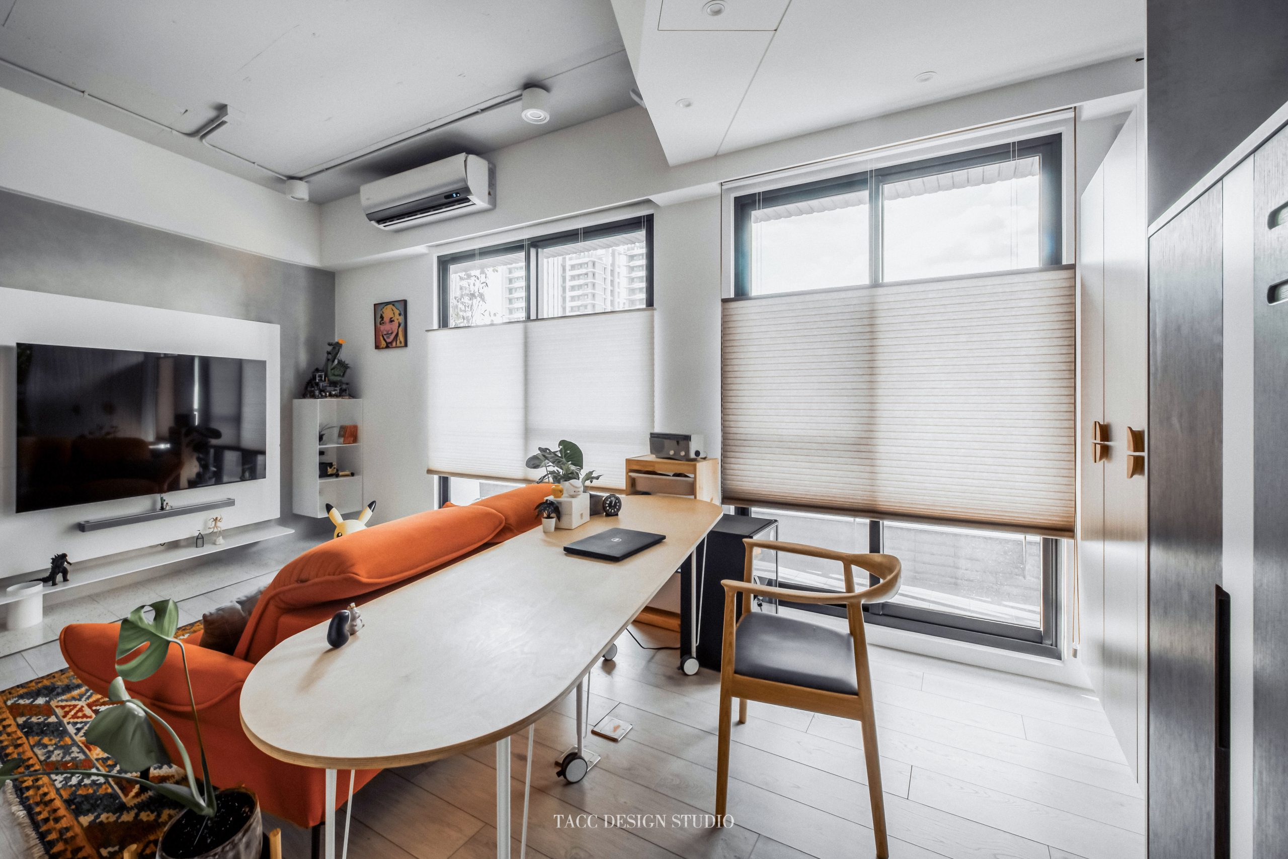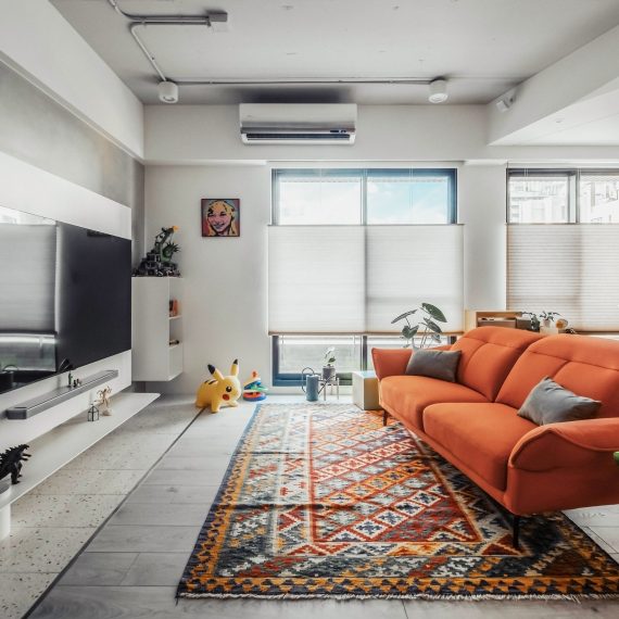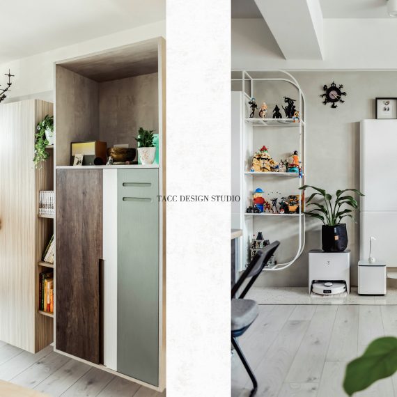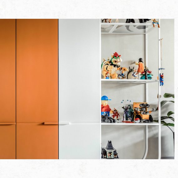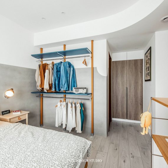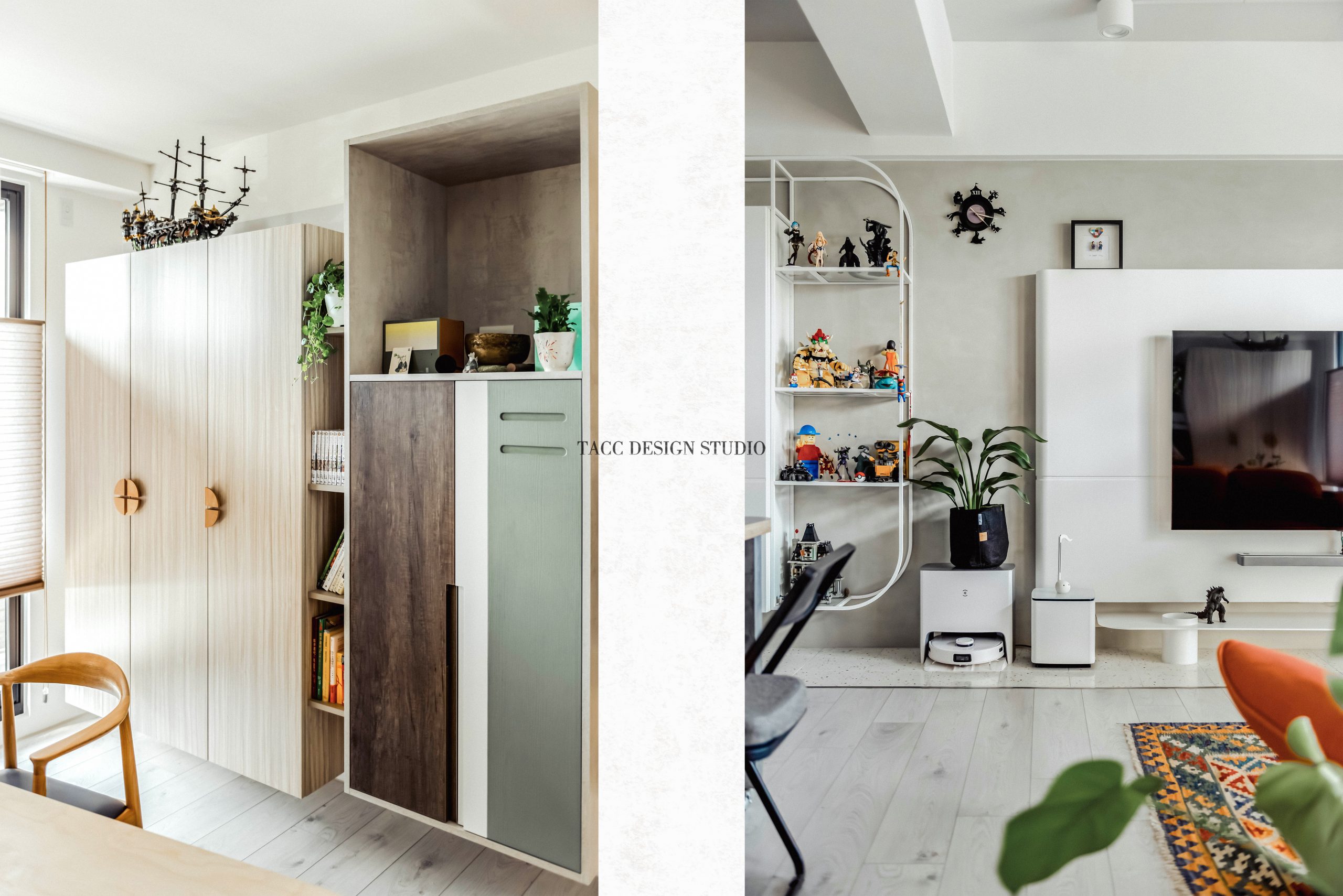 在與一側櫃體存在的當下,用上了一道橘色共同連接起來;