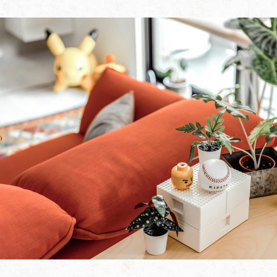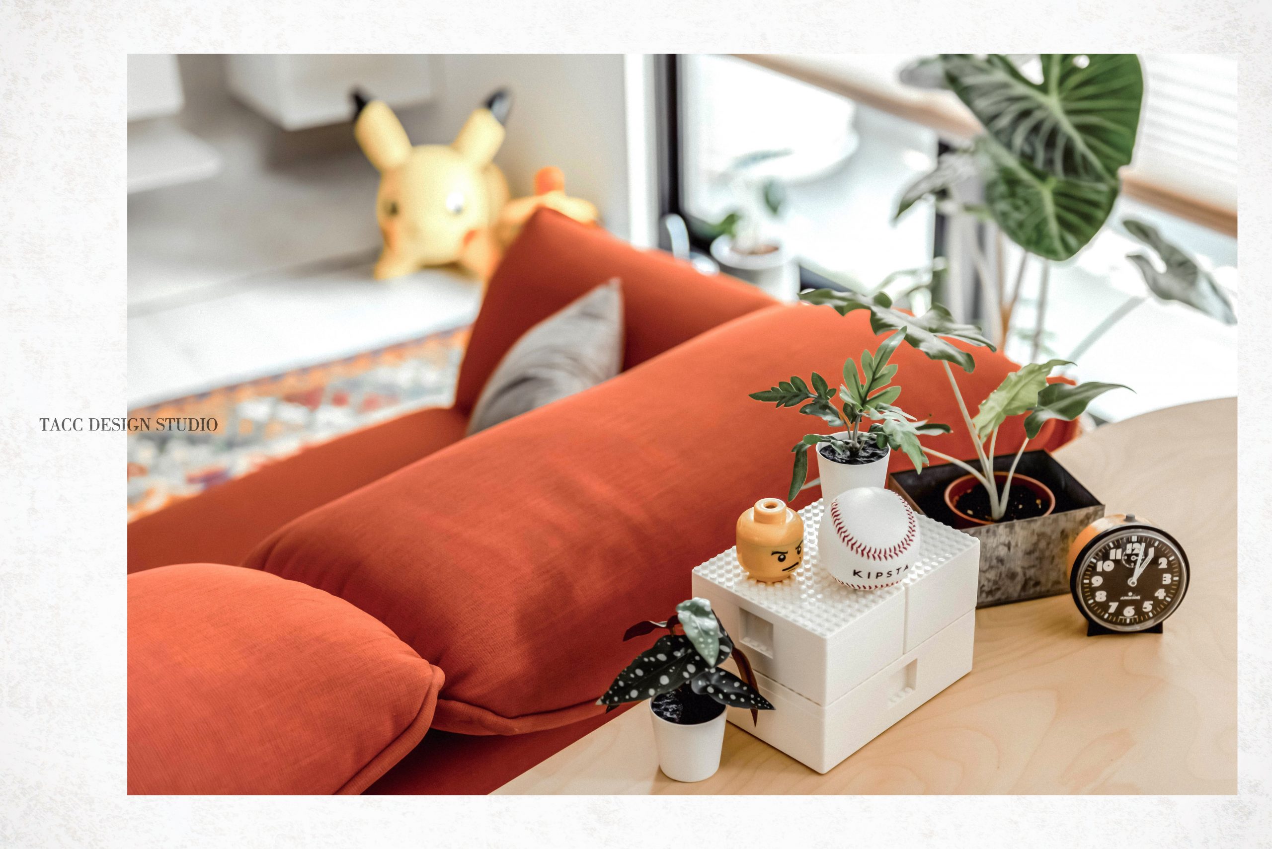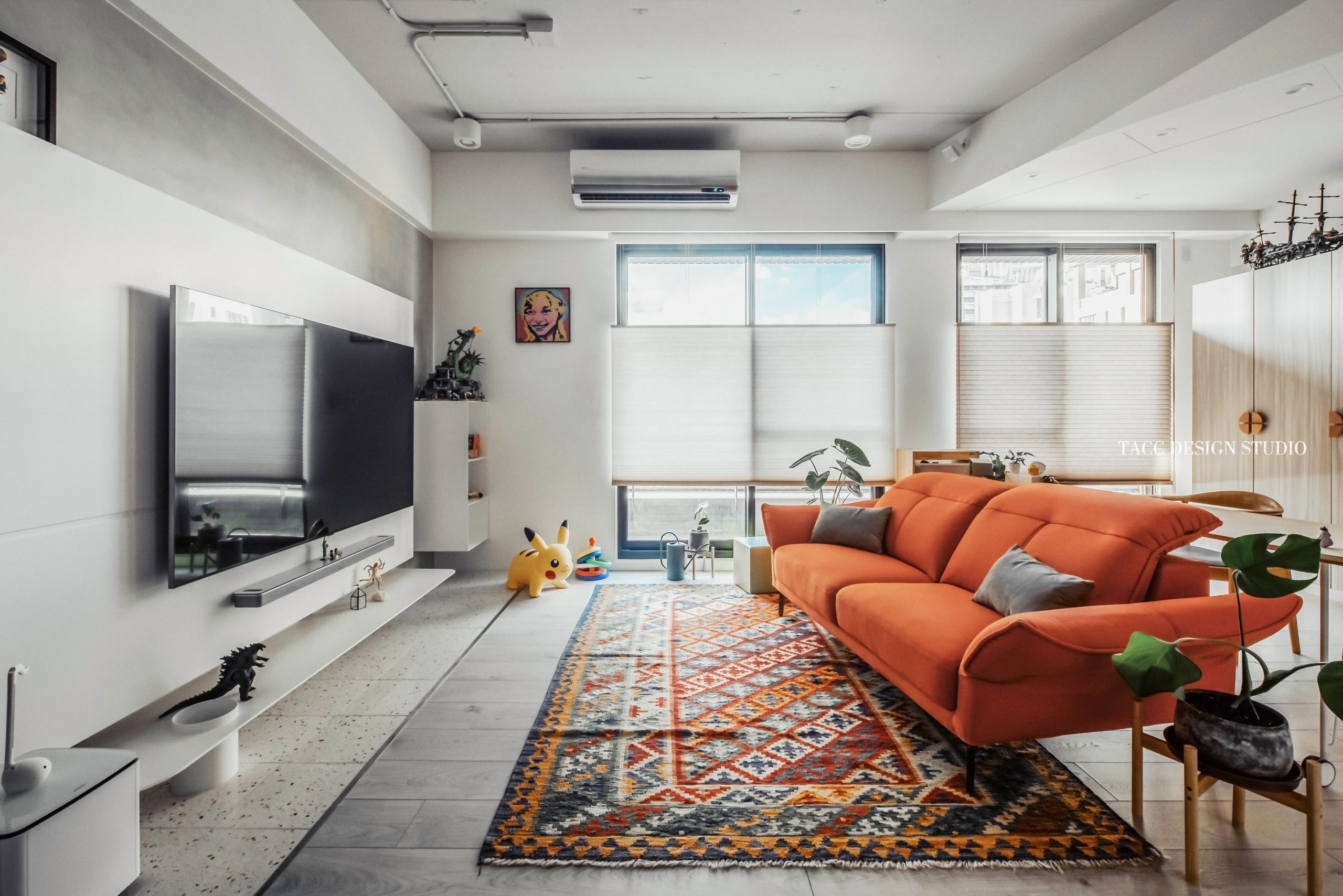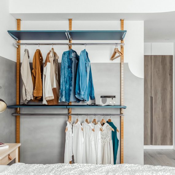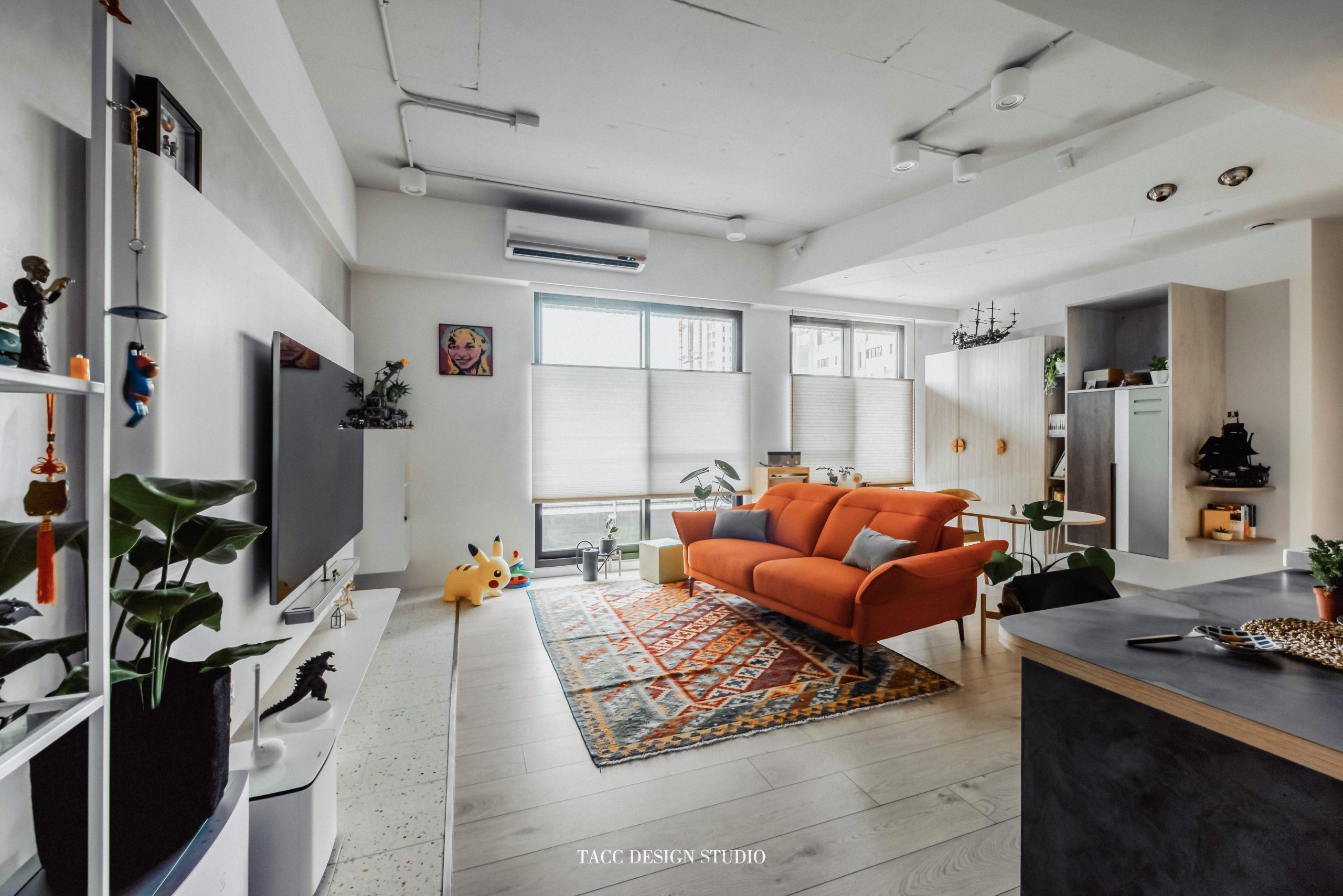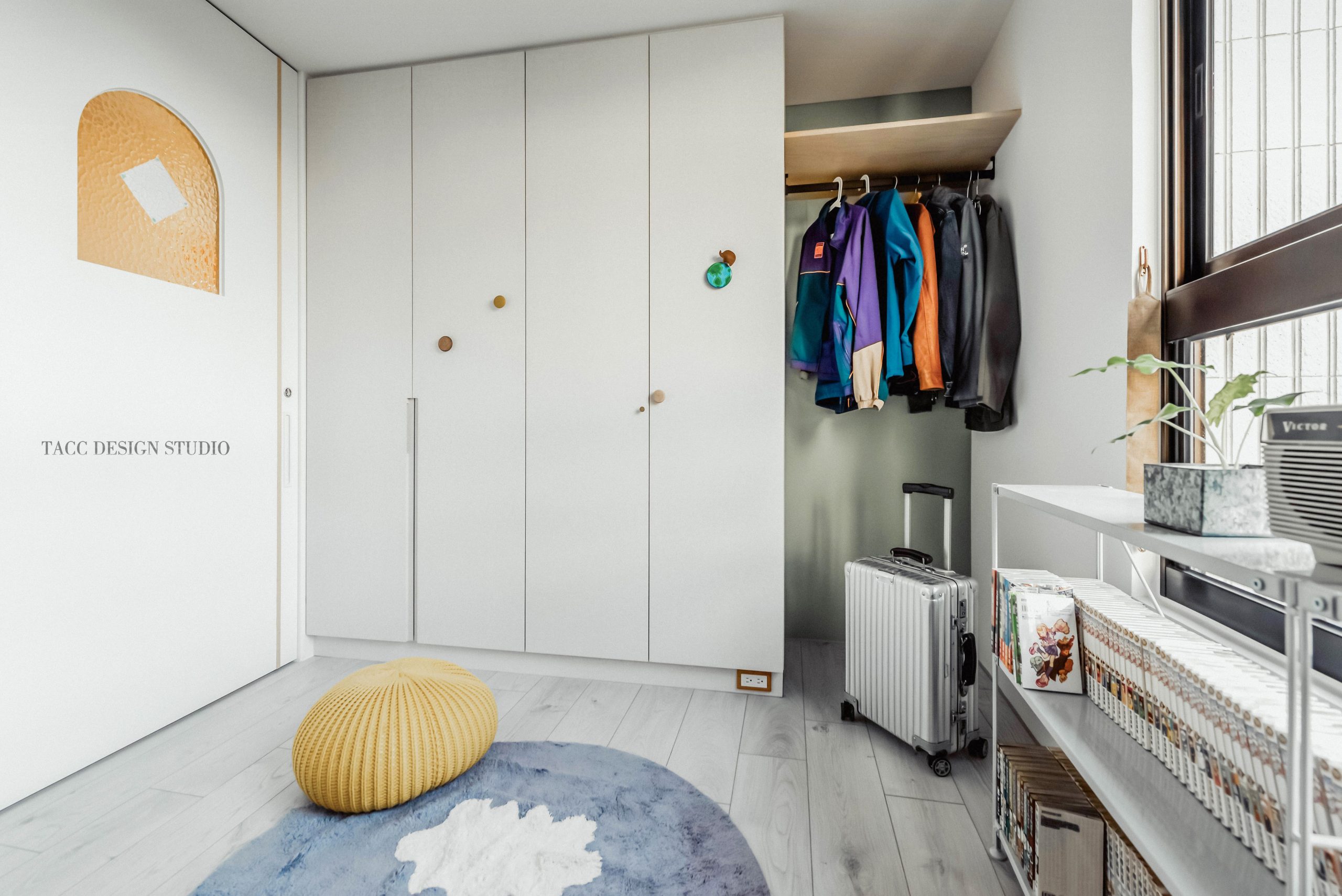在與一側櫃體存在的當下,用上了一道橘色共同連接起來;