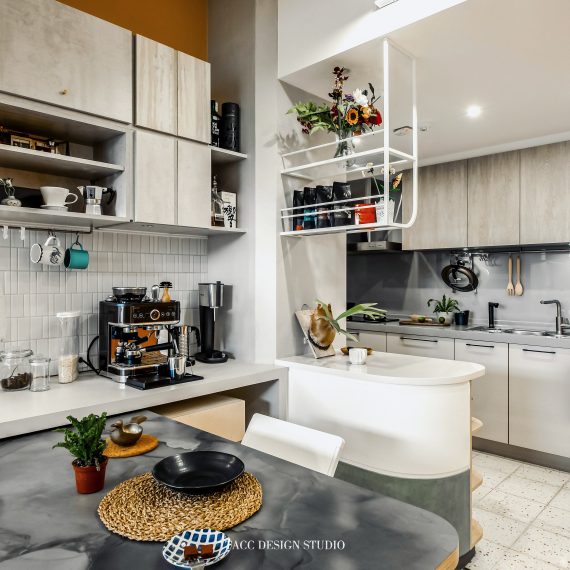 餐邊櫃那道牆一路延伸至廊道側,